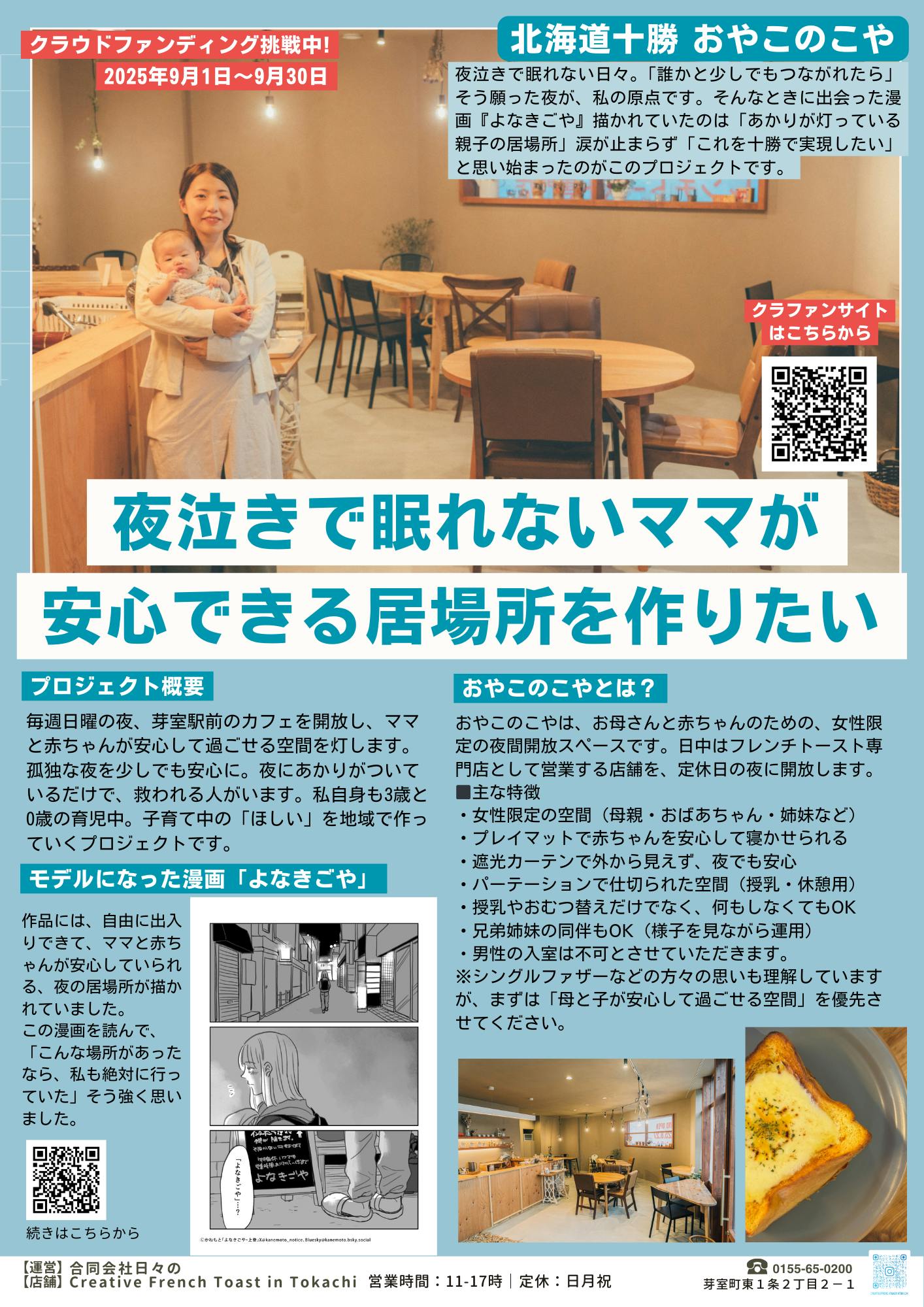 2025/09/10 08:03クラウドファンディングを始めて10日が経ちました。これまで繋がっていなかった方々からのご支援やコメント、直接の声がけをたくさんいただいています。「よなきごやの漫画を読んでいて、まさかこの地域で実現するなんて」「夜泣きが本当に辛かった。こんな場所があれば絶対に行っていた」「同じ思いをしてきたママが他にもたくさんいることが分かり、安心した」そんな声を読むたびに、このプロジェクトを立ち上げてよかったと心から感じています。“ひとりじゃない”という想いが、支援者のみなさんとのつながりからも生まれています。また、取組を紹介するチラシも急ピッチで制作しました。いささかミスもありますが(笑)、まずは形にできてよかったです。「貼ってあげるよ」「配ってあげるよ」と声をかけていただける方がいましたら、ぜひお知らせください!地域のみんなと一緒に、この場所を広げていけたら嬉しいです。引き続き、どうぞ応援よろしくお願いいたします。 もっと見る