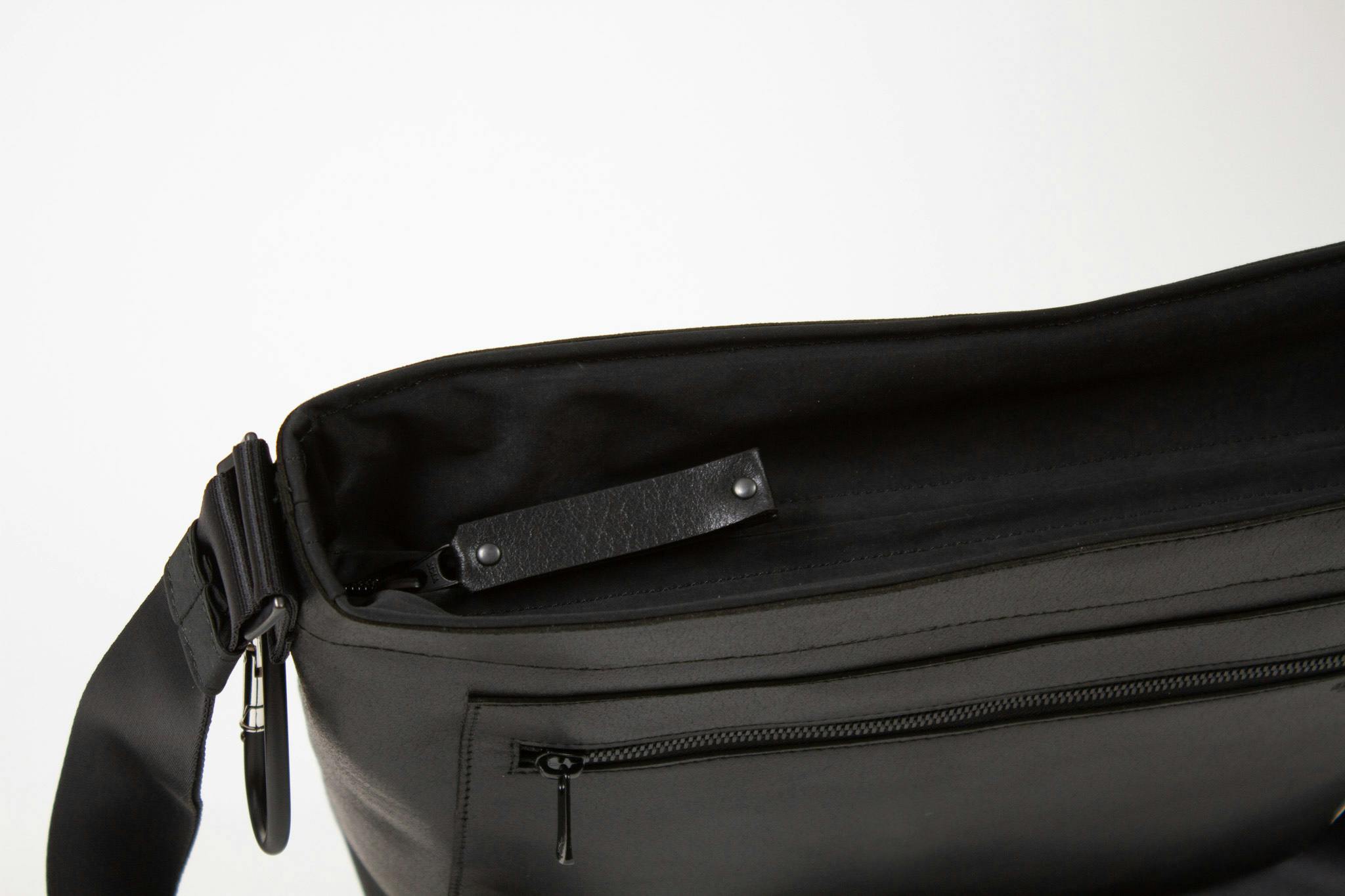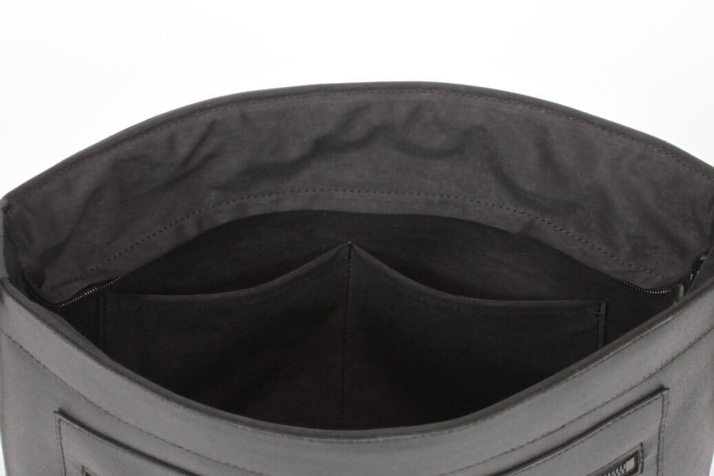 開口部は、ミリクロス素材を使用した落としのファスナー付きの蓋を採用し、開閉しやすくファスナーを配しました。オープンで軽快に、クローズでセキュアに。シーンに応じて表情と安心感を使い分けられます。