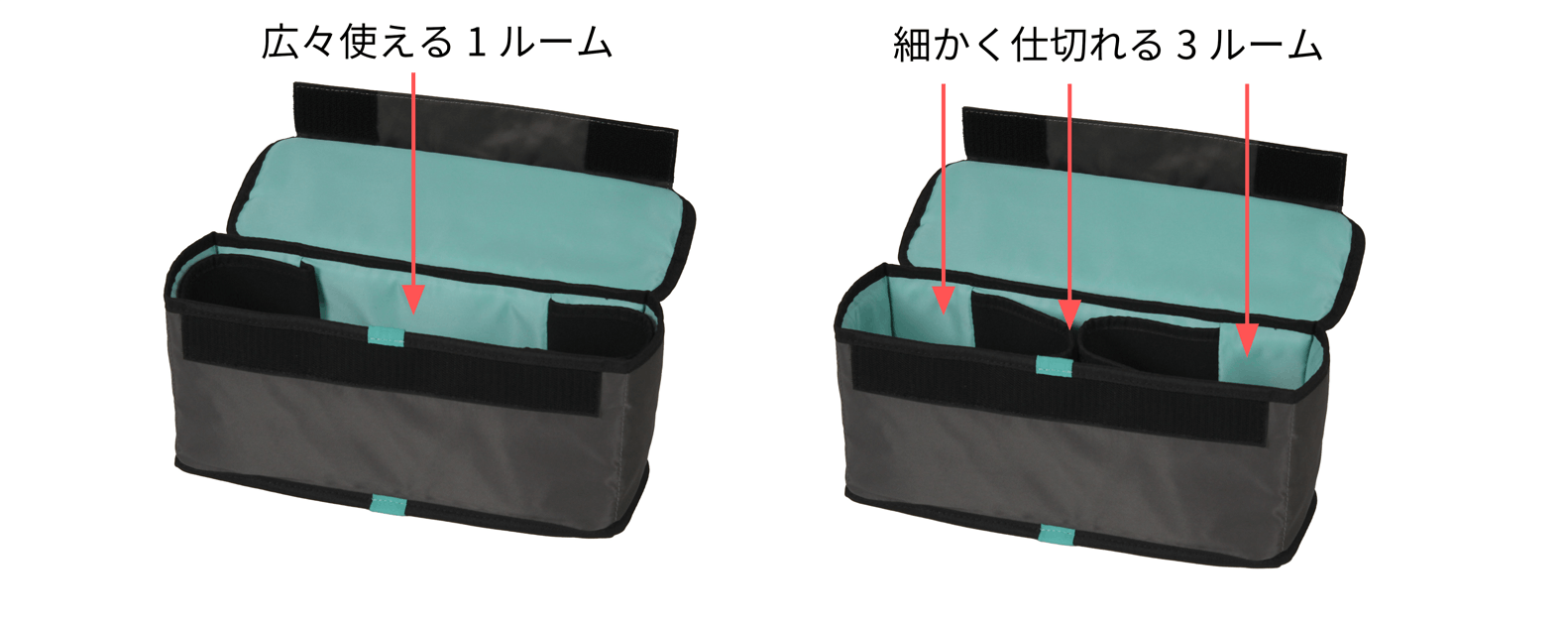 蔵ボックスは中の内羽根をボックス内壁に沿わせれば1ルームに、両方の羽を中心に広げれば3ルームに仕分けることができます。内羽根はクッション性があるので機材同士がぶつかり合うこともありません。