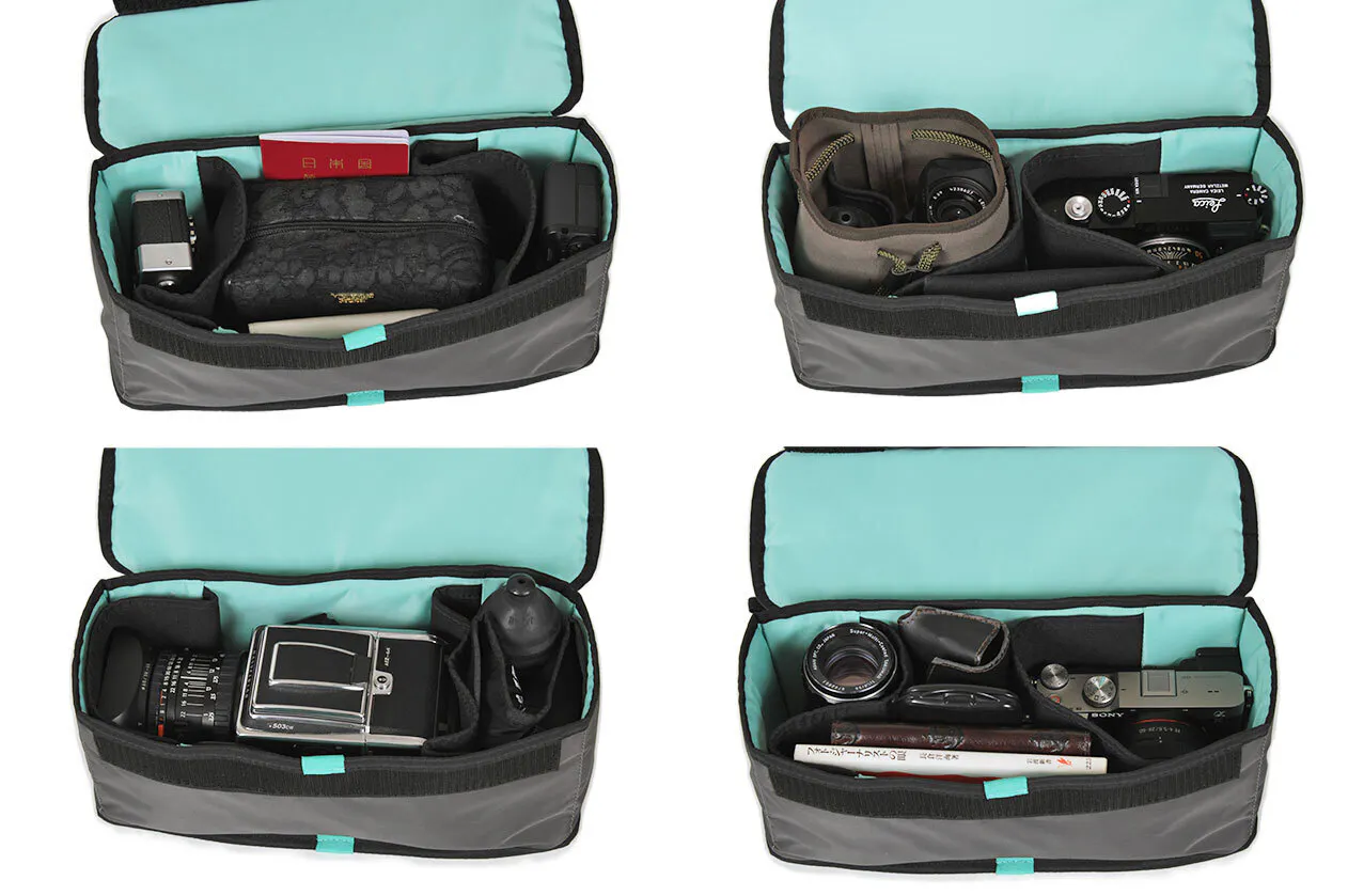 バッグ自体はカジュアルな見た目を保ちながら、内部には着脱可能な専用インナーケースを内蔵。底板とクッションで守られた下部にはカメラ機材、上部には日常品を収納できる上下二層構造。カメラを持ち運ばない日は、インナーケースを取り外して通常の軽量バッグとしてもご使用いただけます。