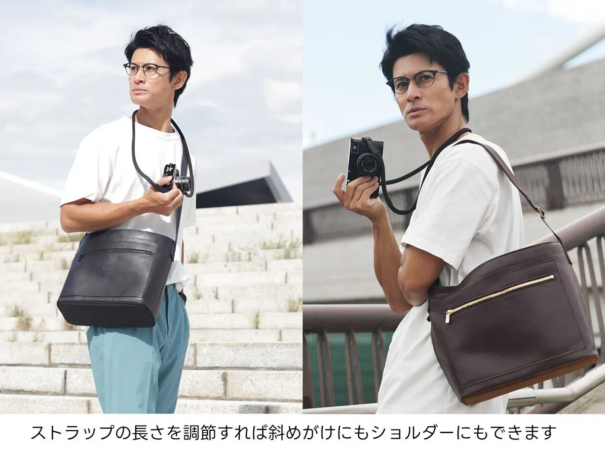 このバッグの真髄は、その高い機能性と二面性。一見すると洗練されたカジュアルバッグですが、内部には取り外し可能な専用インナーケースを内蔵。底面のクッションと底板が大切なカメラ機材をしっかりと守ります。カメラやレンズはバッグ下部に、その上の空間には手帳や財布といった日用品を分けて収納できる、スマートな設計です。
