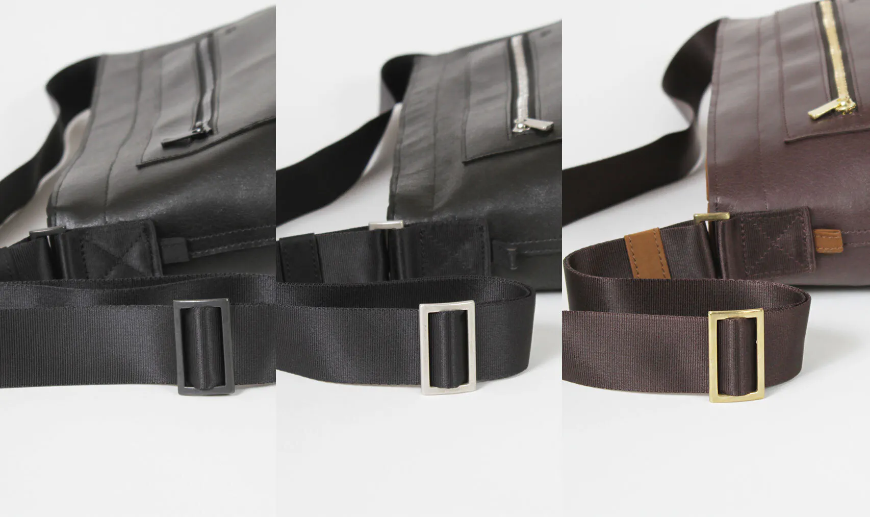 それぞれカジュアル面のファスナーに合わせてストラップアジャスト金具のカラーを美しく配色。