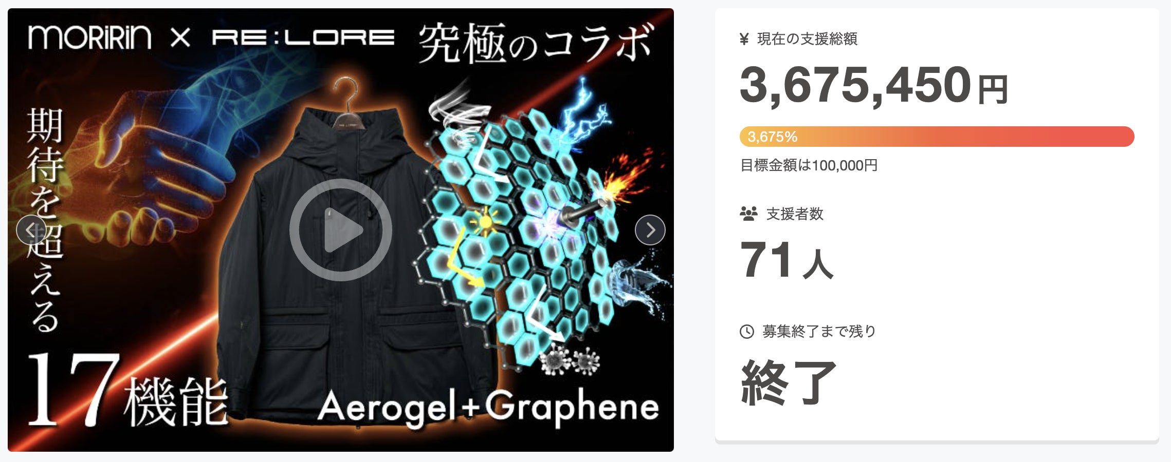 中でも、『TECH 4WAY EXTREME JACKET PRO』のテクノロジーの核となる「エアロゲル布団」のプロジェクトでは、3年連続でクラファン支援額1億円を超える大きな反響をいただきました。
