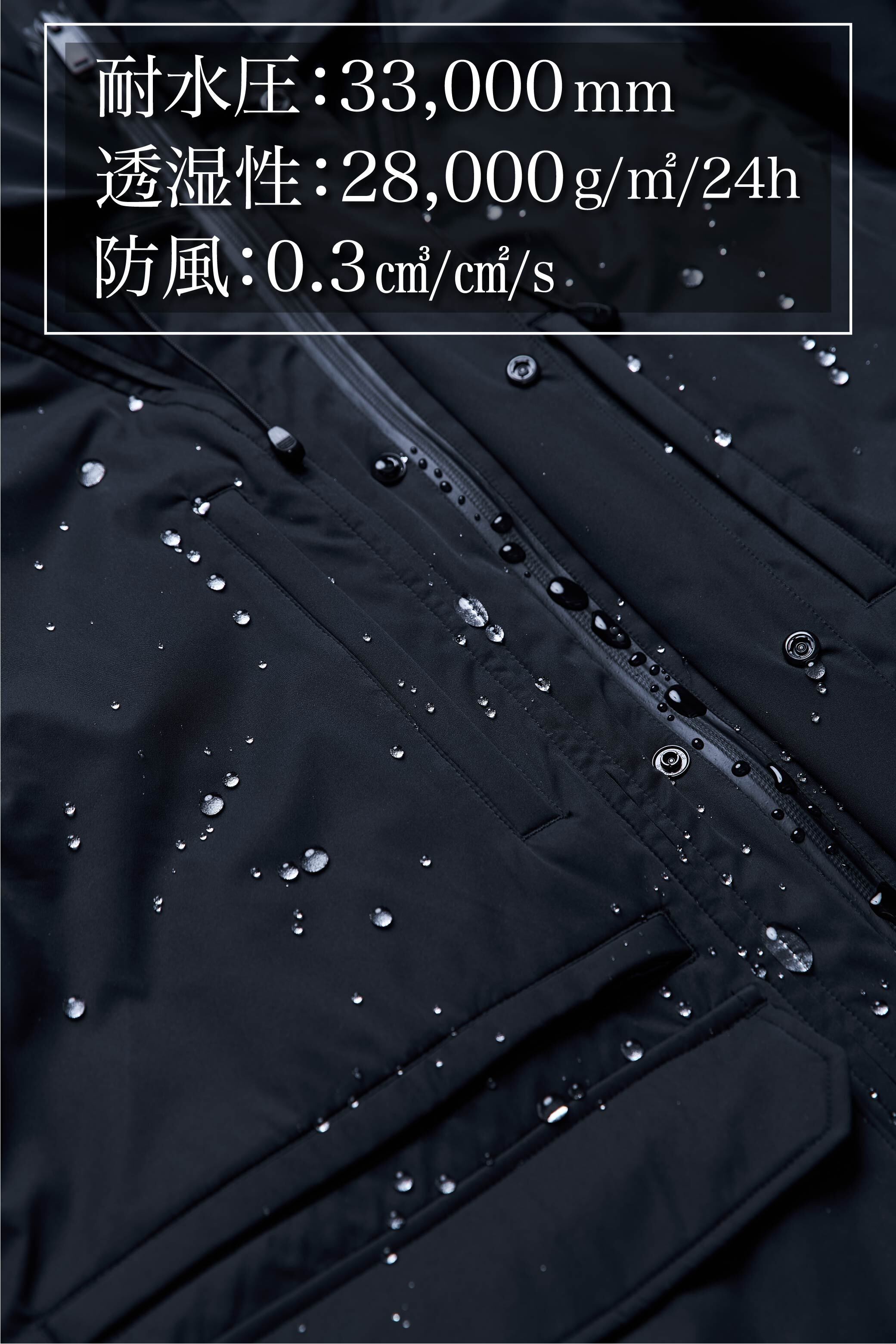 耐水圧:20,000mm以上で、嵐に耐えられると一般的に言われており、それを大きく上回る耐水圧33,000mmは、驚異的な数値となっております。