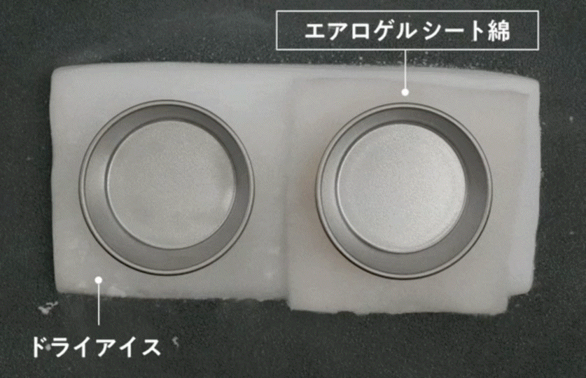 エアロゲルシート綿を挟むことで、ドライアイスの上の水も凍りません。