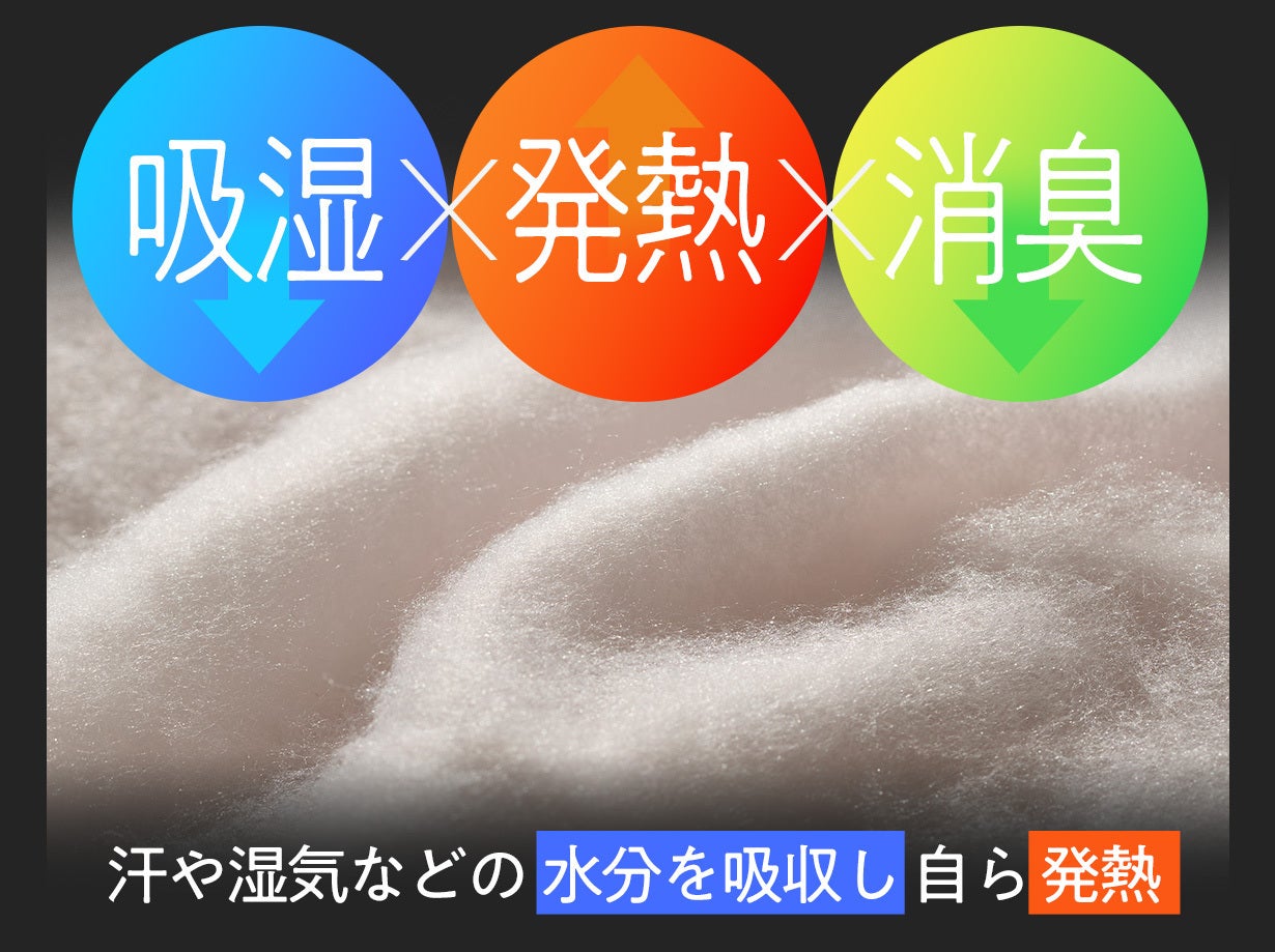 衣服内の汗などの湿気を吸収し、熱に変換する「発熱効果」と「蒸れを防ぐ効果」があります。