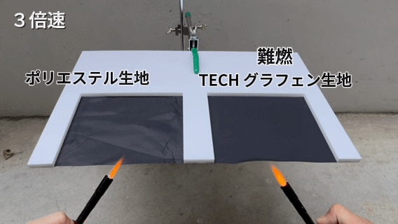 一般的に撥水性と難燃性(燃えにくい機能)は相反する機能とされており、このTECHグラフェン生地のように高いレベルで両方の機能性を兼ね備えている生地は他に知りません。