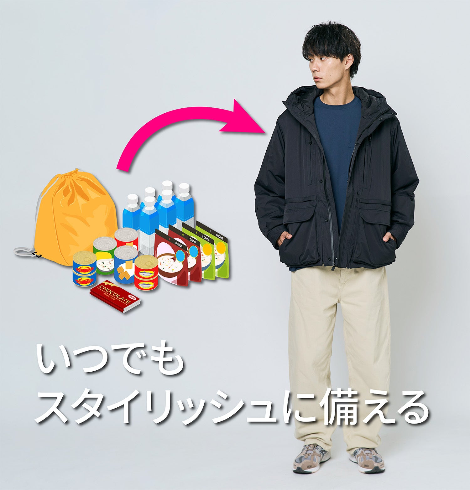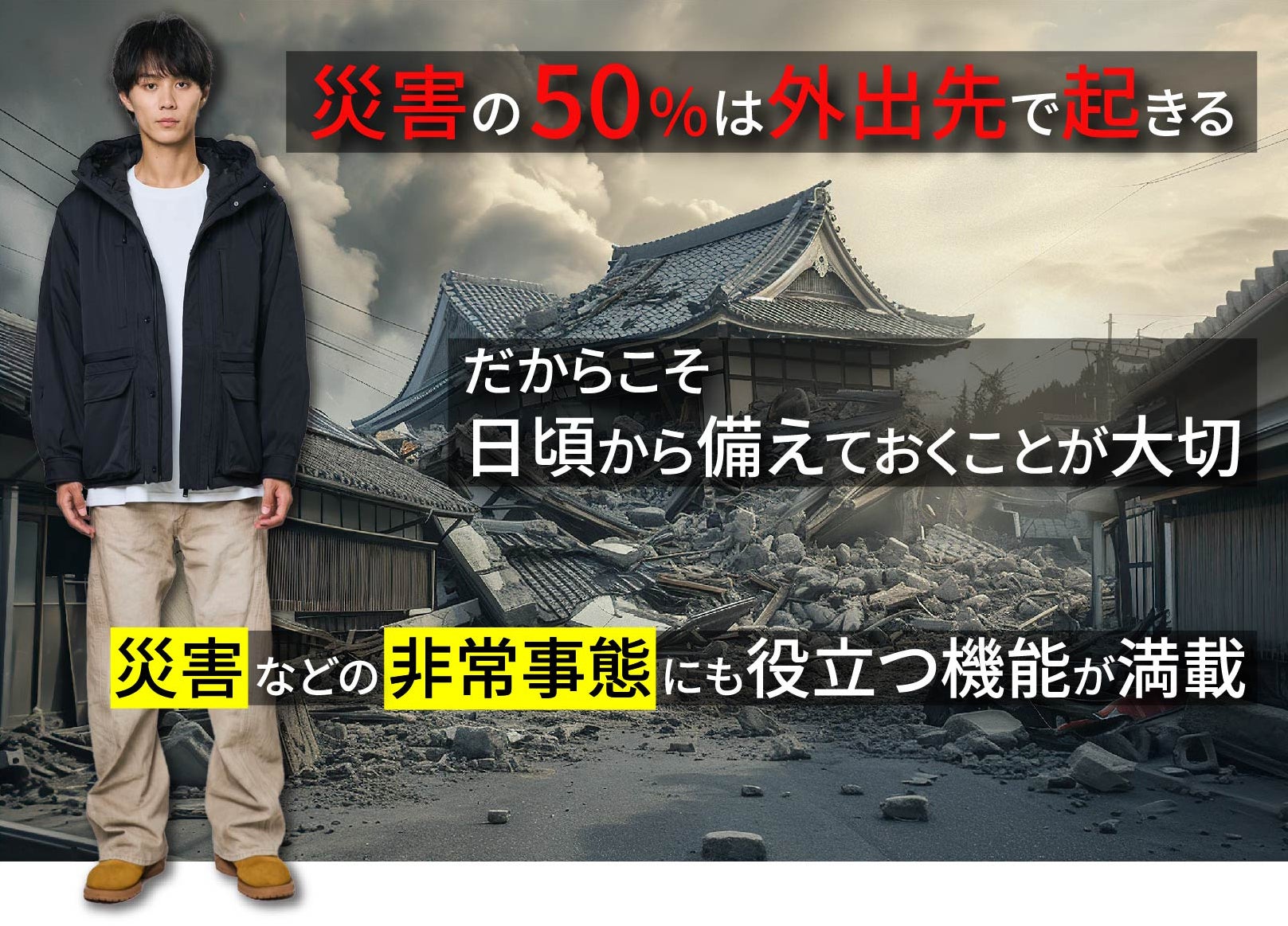 「TECH 4WAY EXTREME JACKET PRO」なら、圧倒的な保温性と大容量の収納ポケット、防水・難燃・高耐久などの機能性で災害対策としても大いに活躍してくれます。