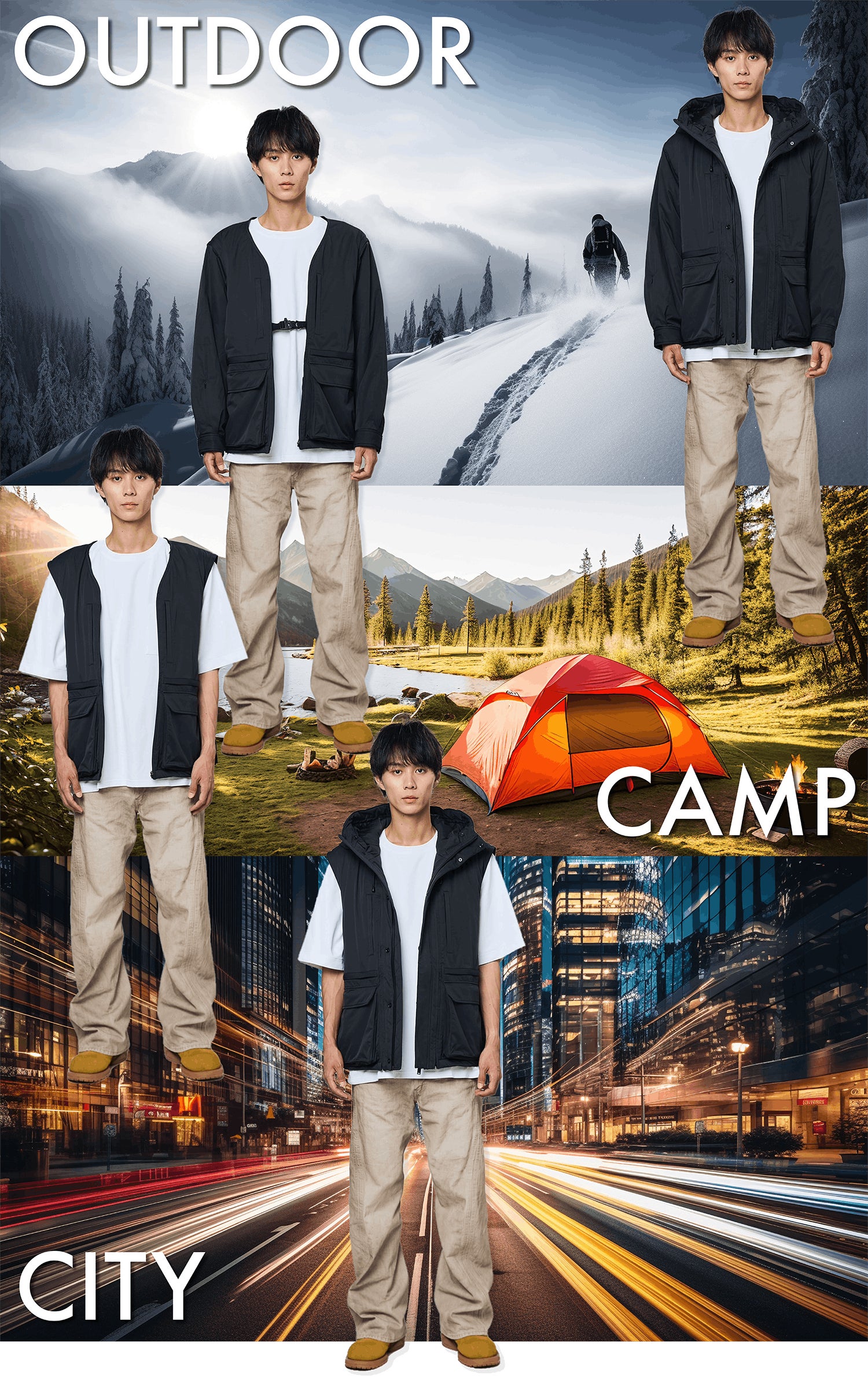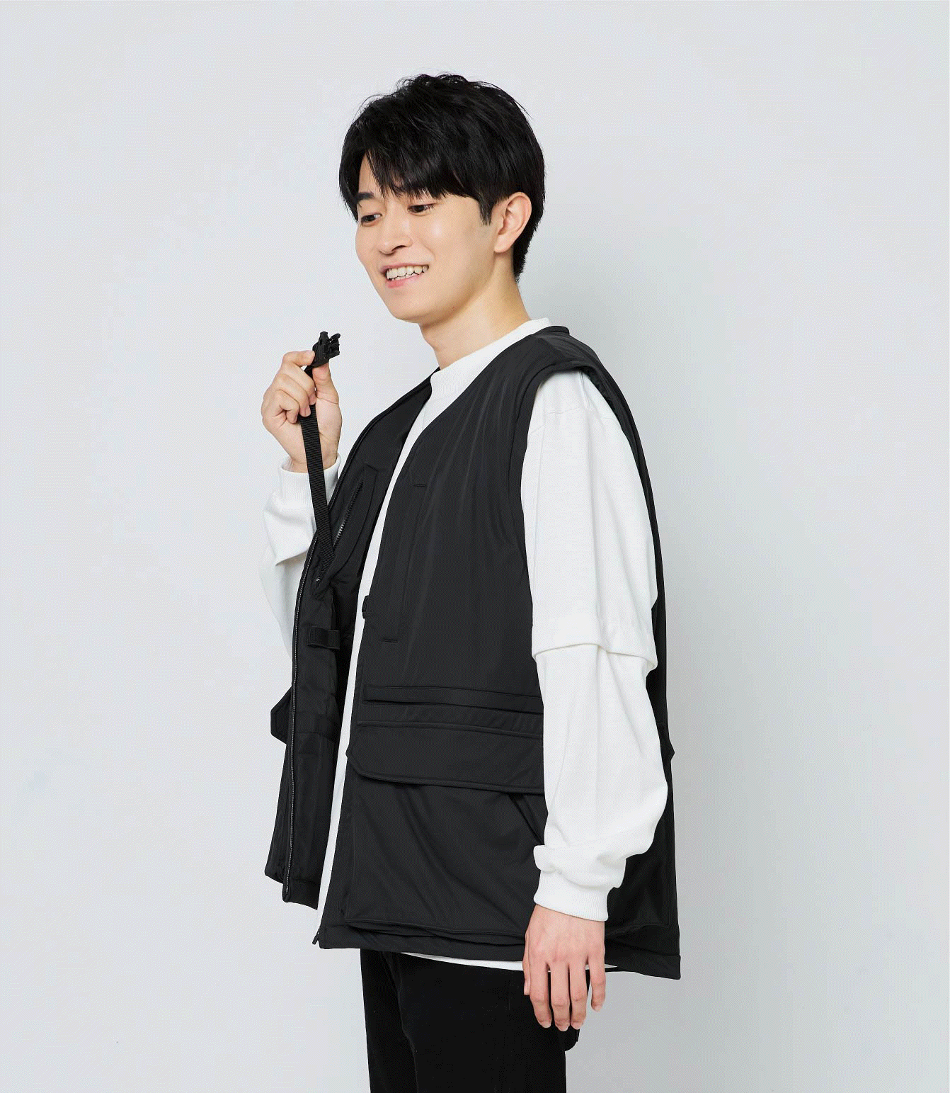 ウールジャケットや、レザージャケットなど、お気に入りのアウターのインナーとして着用することで、保温性や収納力を大幅に向上させてくれます!