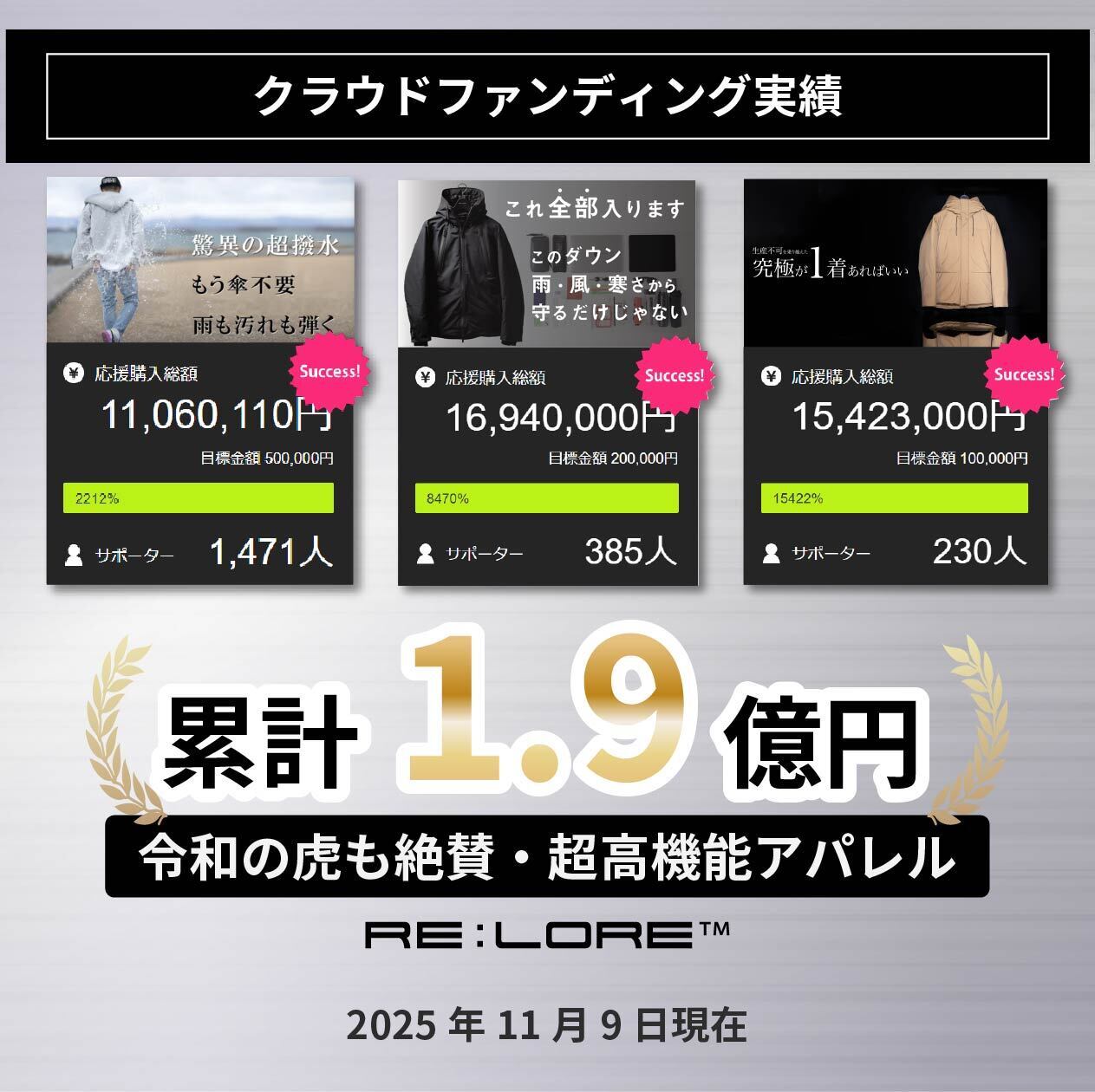 おかげさまでRE:LOREは、クラウドファンディングで累計8,000名様から、1.9億円以上ものご支援をいただいております。