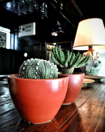 ダークな雰囲気に赤の植木鉢がオシャレに映えます。