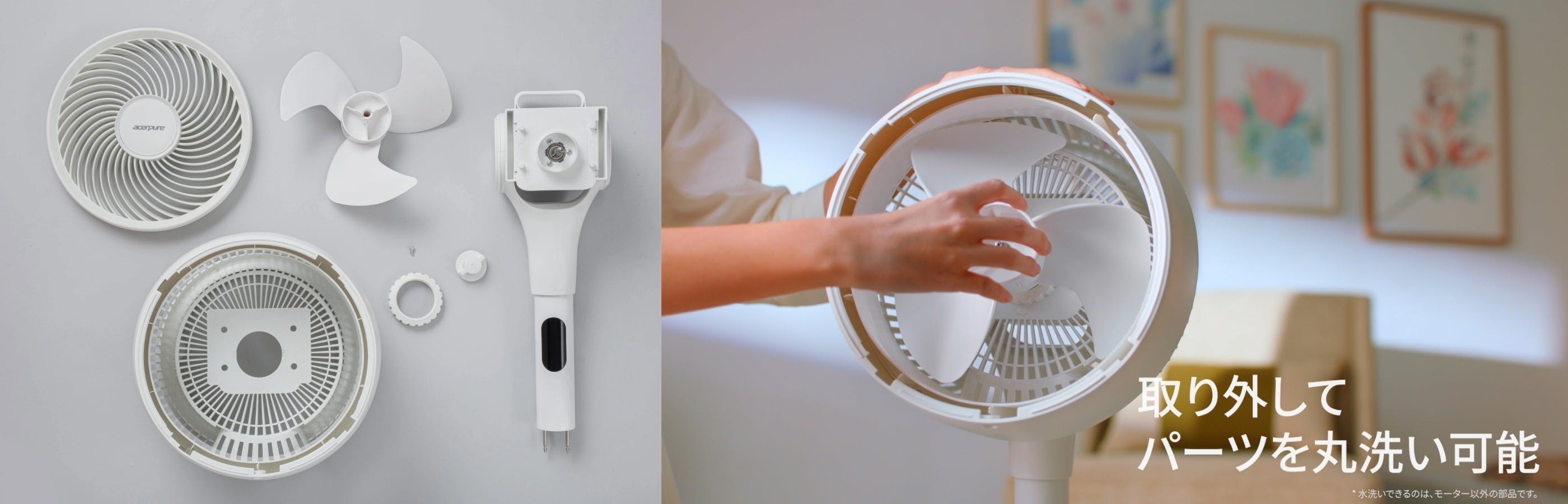 モーター以外の部品は丸洗い可能。ネジ式ファンガードで、デザイン性と安全性を両立しました。