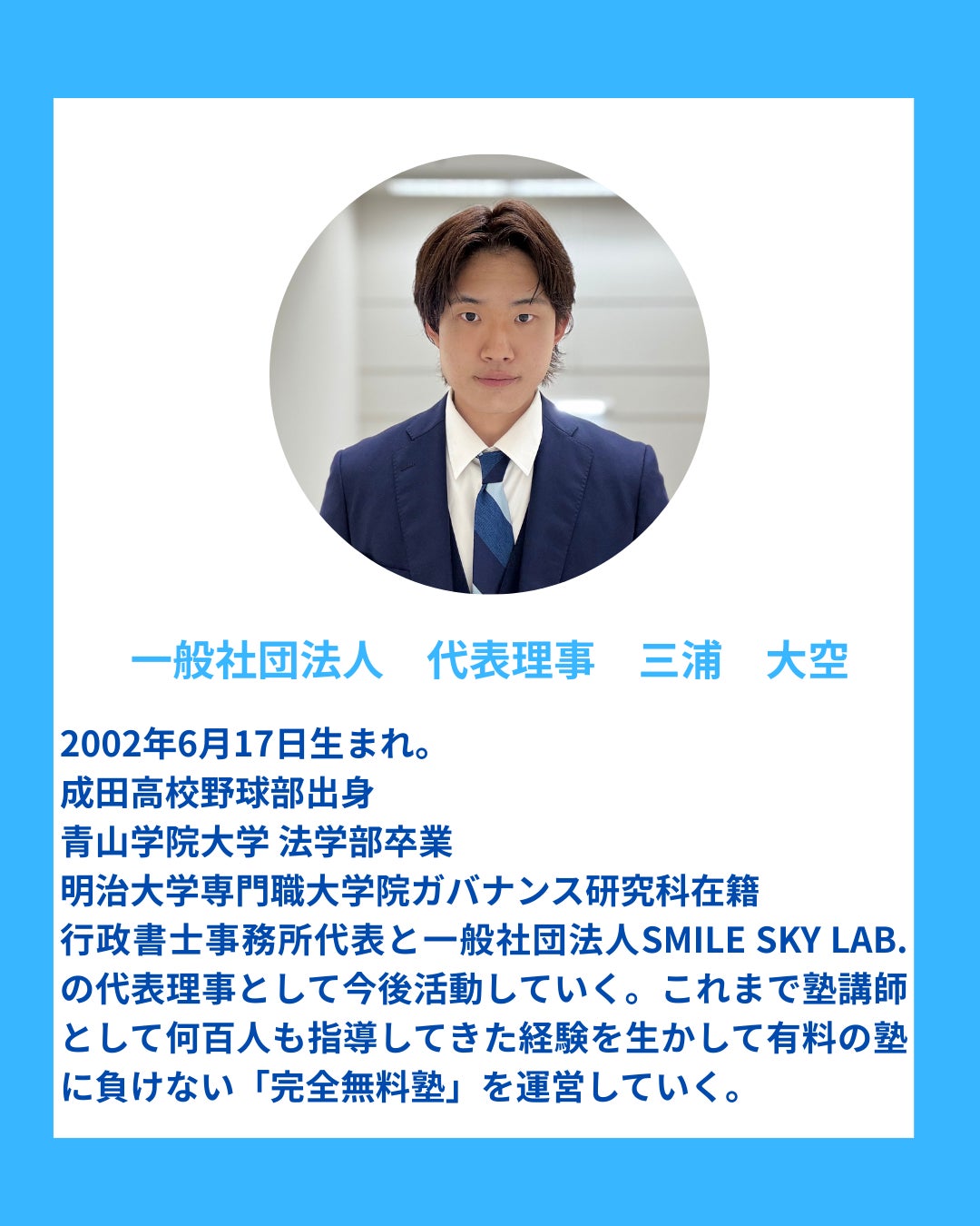 一般社団法人SMILE SKY LAB.代表理事の三浦 大空(みうら そら)と申します。