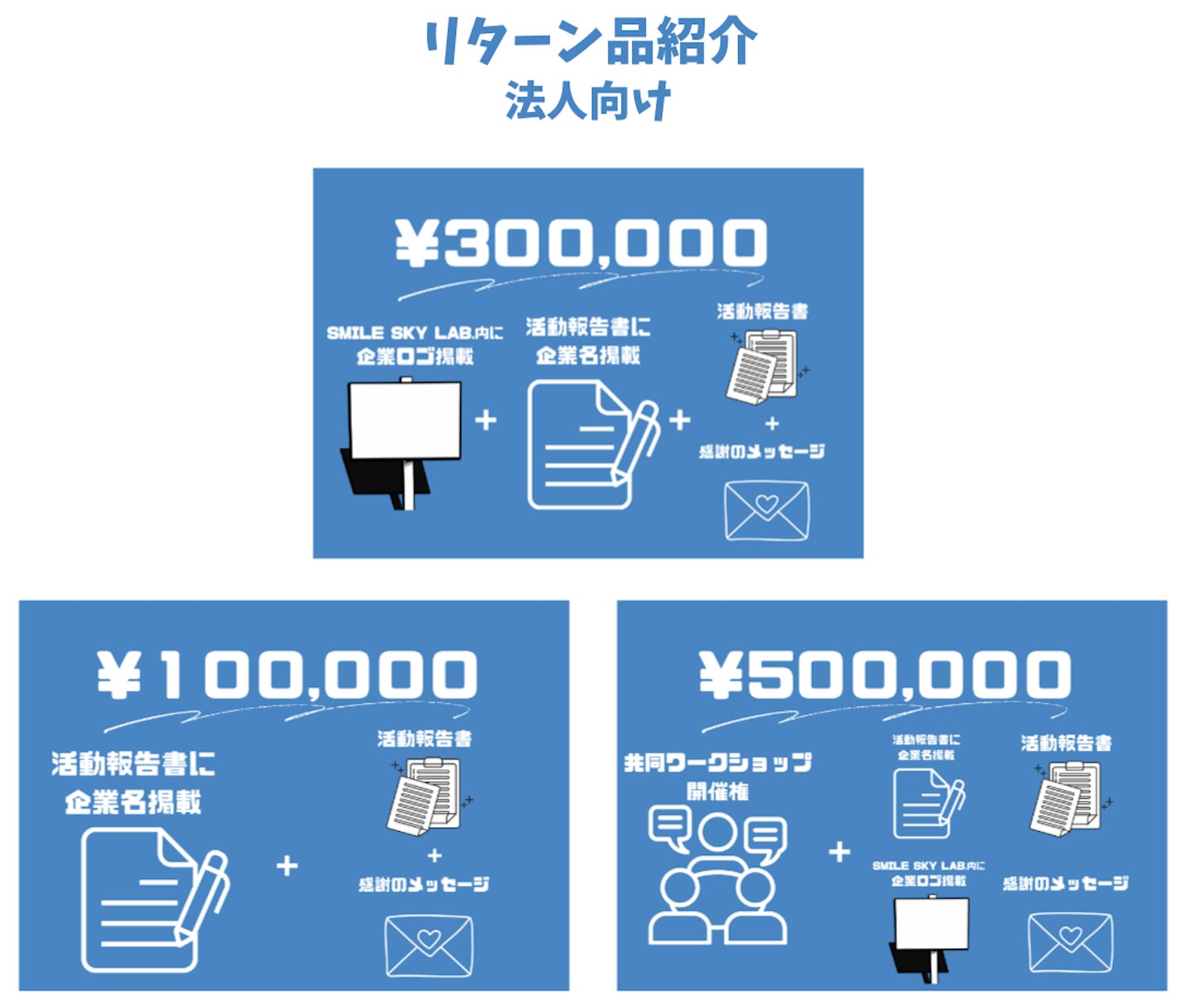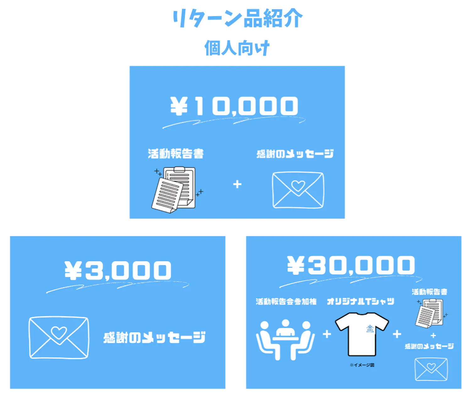 リターン品については個人様向け、法人様向けでご用意しています!ご支援いただいたあとの進捗をご支援者様に報告いたします。