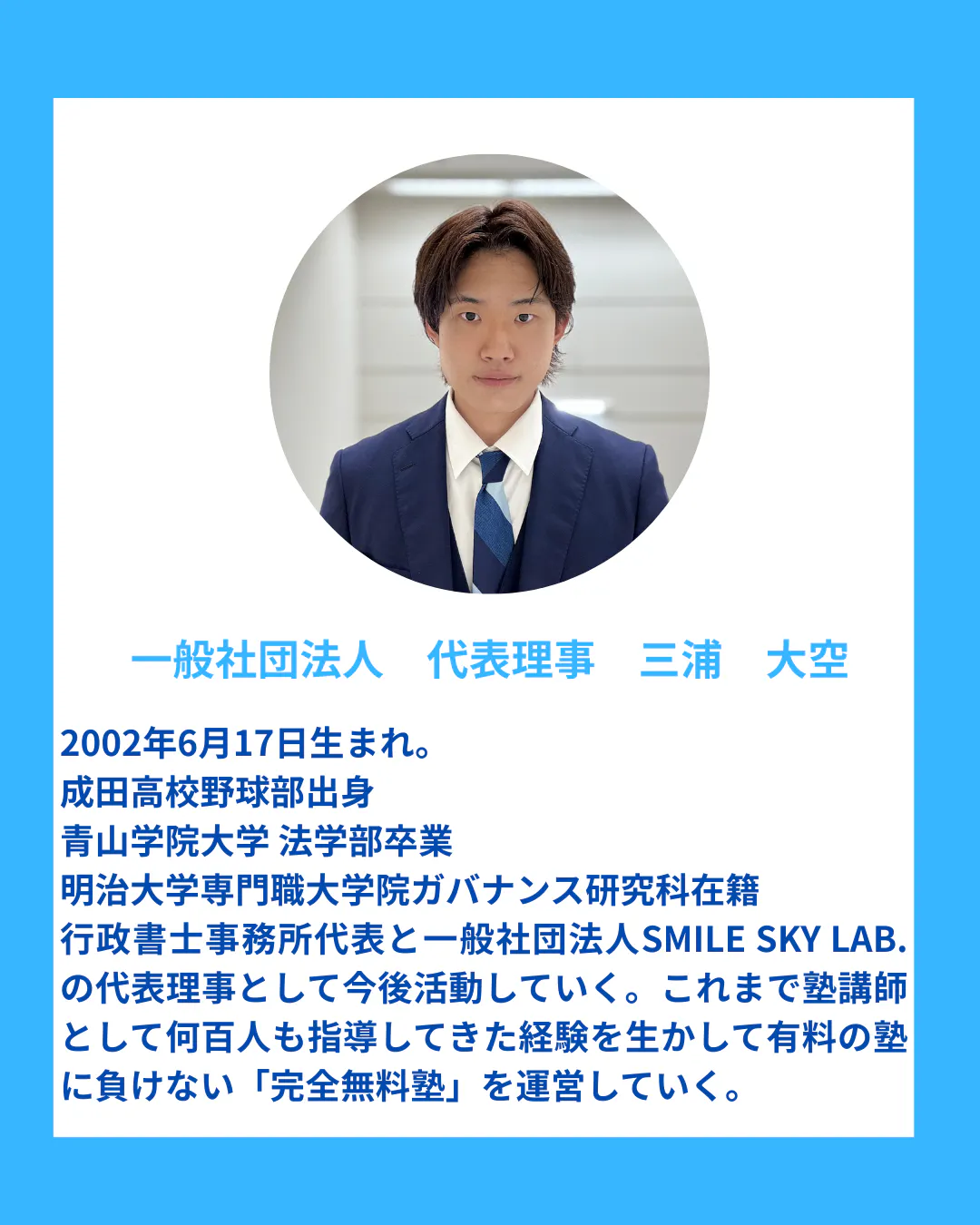 一般社団法人SMILE SKY LAB.代表理事の三浦 大空(みうら そら)と申します。