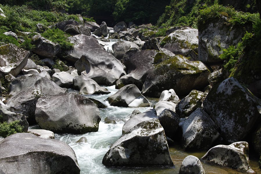 寄ってみると、奇岩・奇石とその間を流れる渓流が織り成す自然の絶景です。ここは斐伊川の支流にあり、ヤマタノオロチの神話とは直接の関係はありませんが、『出雲国風土記』にはこの地にまつわる神話が載っています。