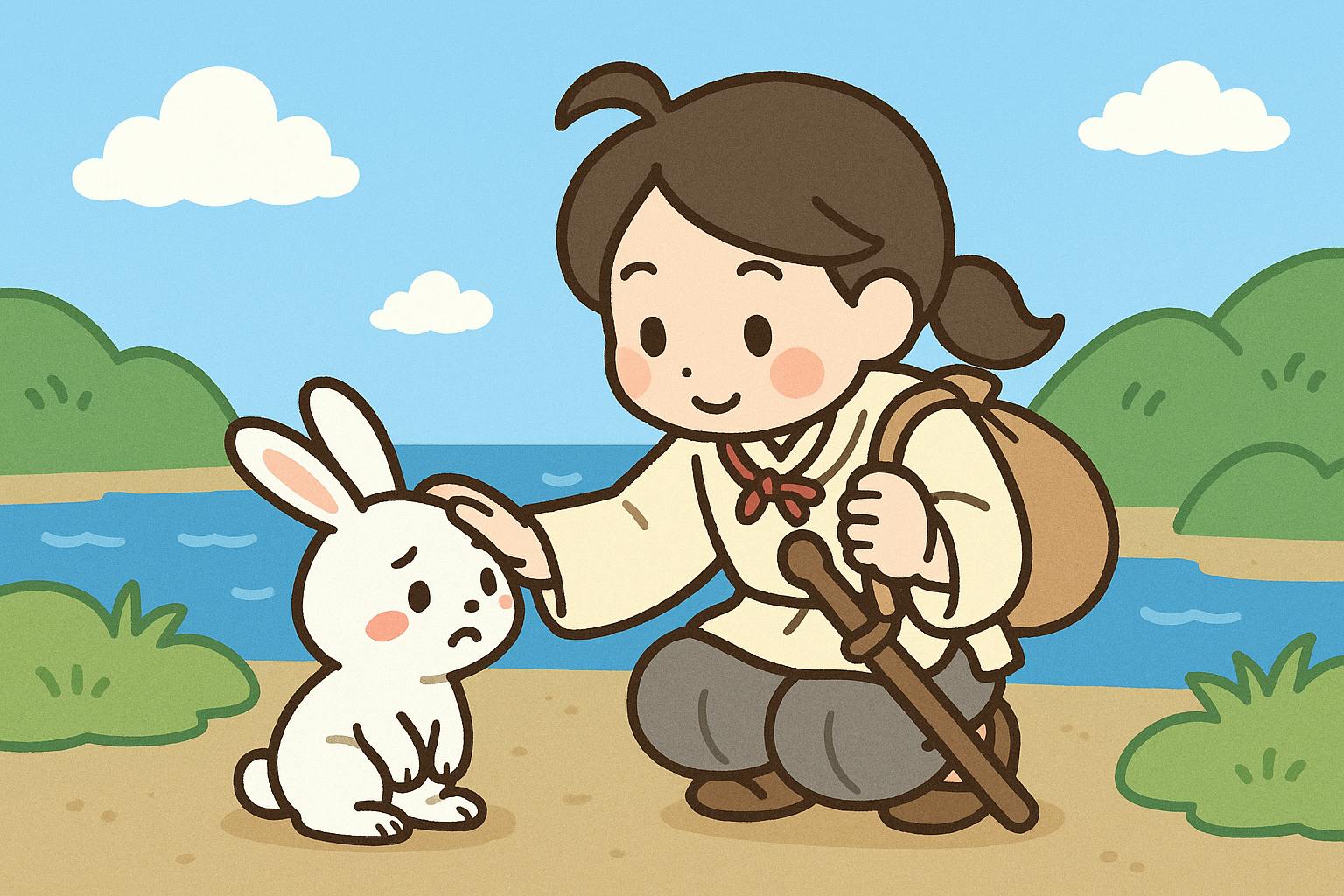 大国主命は、「それは違うよ。川の真水で洗い、蒲(がま)の穂を敷いて寝ていなさい」と教えたので、その通りにした兎は元気を取り戻しました。