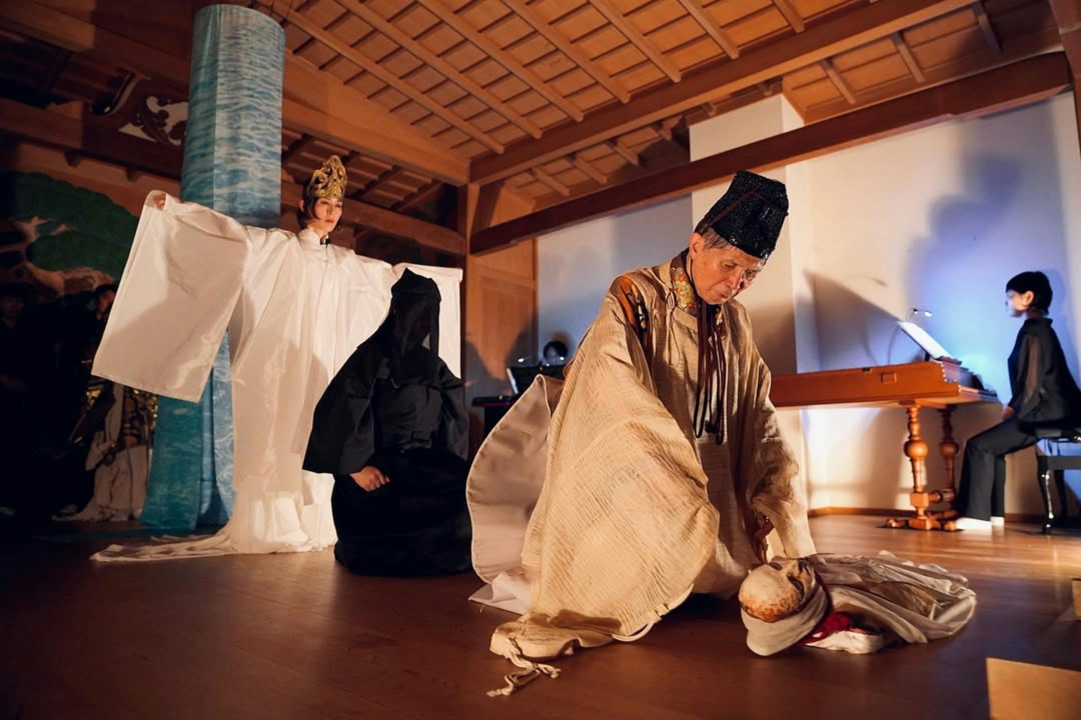 ちなみに上の写真は、日本神話のイザナギ命の冥界下りと、ギリシャ神話のオルフェウスの冥界下りを重ね合わせ、新たな舞台作品として再構築した『冥界の秘儀』です。手前側が私です。
