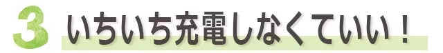 1回の充電で連続稼働で2.5時間動き続けます。長時間バッテリー採用なので、いちいちわずらわしい充電をしなくてすみます。