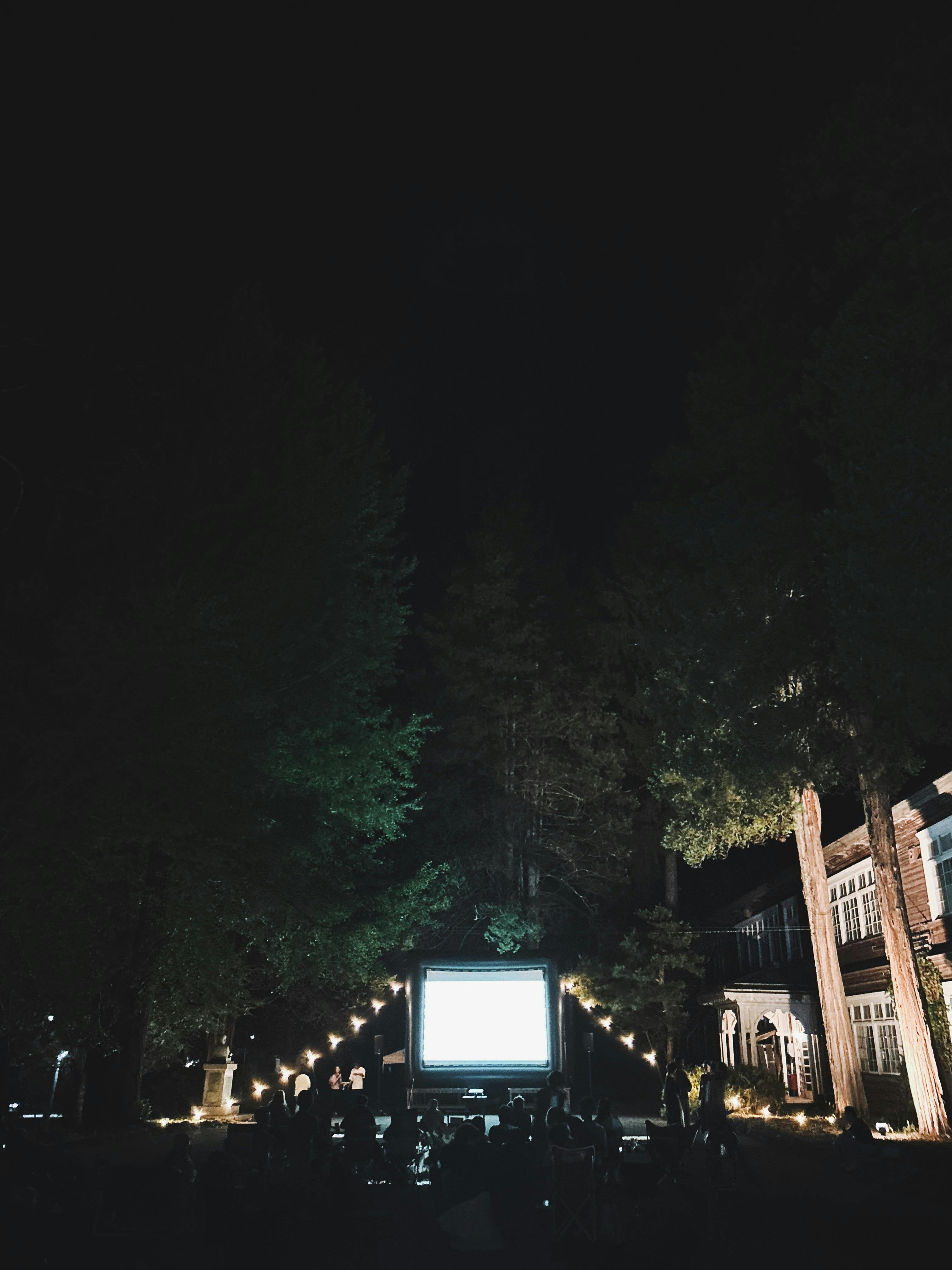 映画祭上映風景、後ろに美しく照らされた校舎が見える