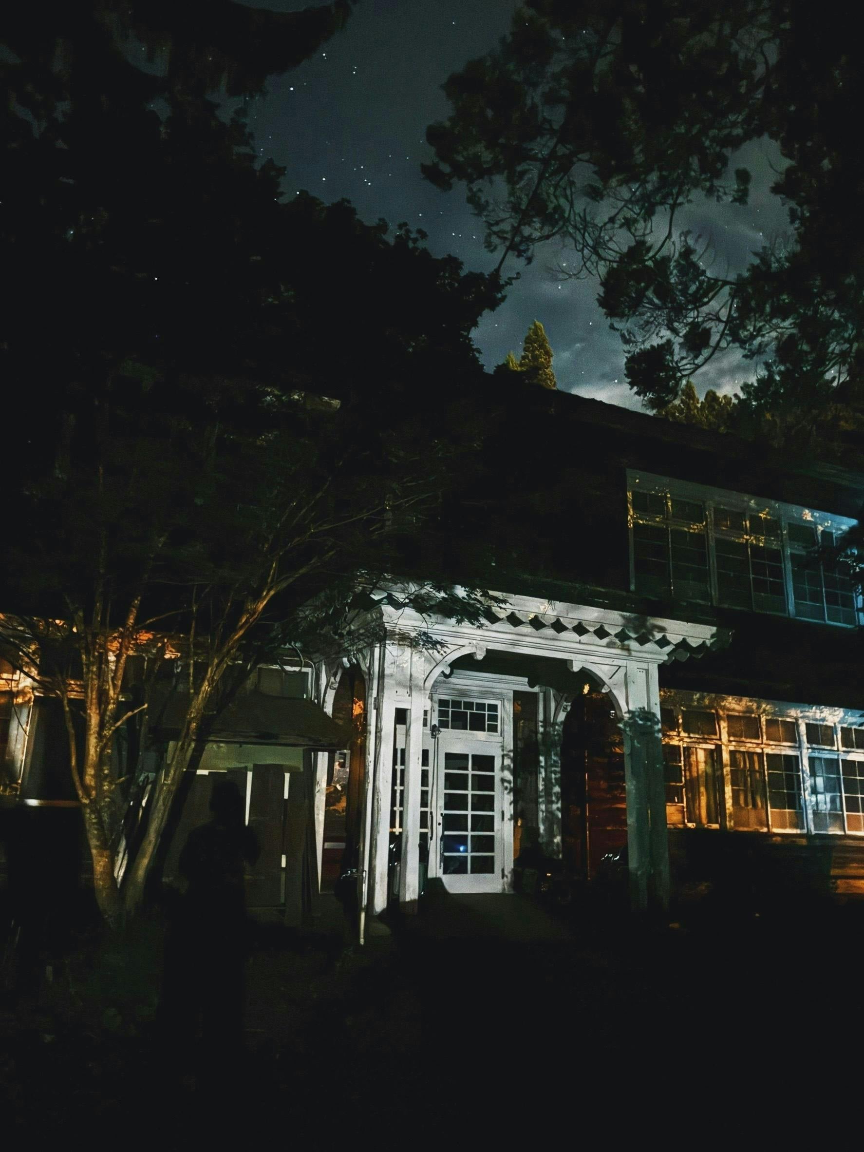 映画祭上映風景、後ろに美しく照らされた校舎が見える