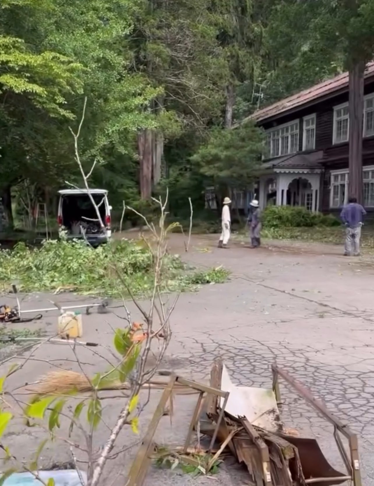 幸運にも降り続いた雨が止み、爽やかに晴れ渡った開幕の朝。竹箒で広場を清める私たちを見つめる、あるお爺さんの姿がありました。しばらくそこに佇んでいたその人は、清々しい陽光に目を細めながら、校舎の二階の角の部屋をじっと見つめ、やがて静かにこう言いました。「昔、あそこで結婚式をしたんだ……」