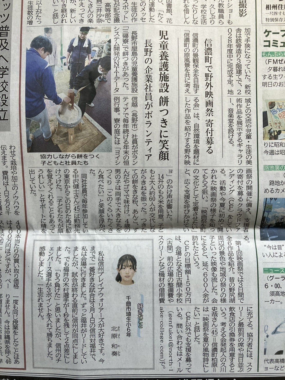 2025/12/12 21:31信濃毎日新聞朝刊に、映画祭の記事を掲載いただきました。この映画祭が、信濃町の夏の風物詩になり、多くの若者や地元の人たちが集う場所になればと願っています。プロジェクトも終盤戦となりました。心温かい支援や、言葉に大変勇気づけられております。引き続きご協力どうぞよろしくお願いいたします。 もっと見る