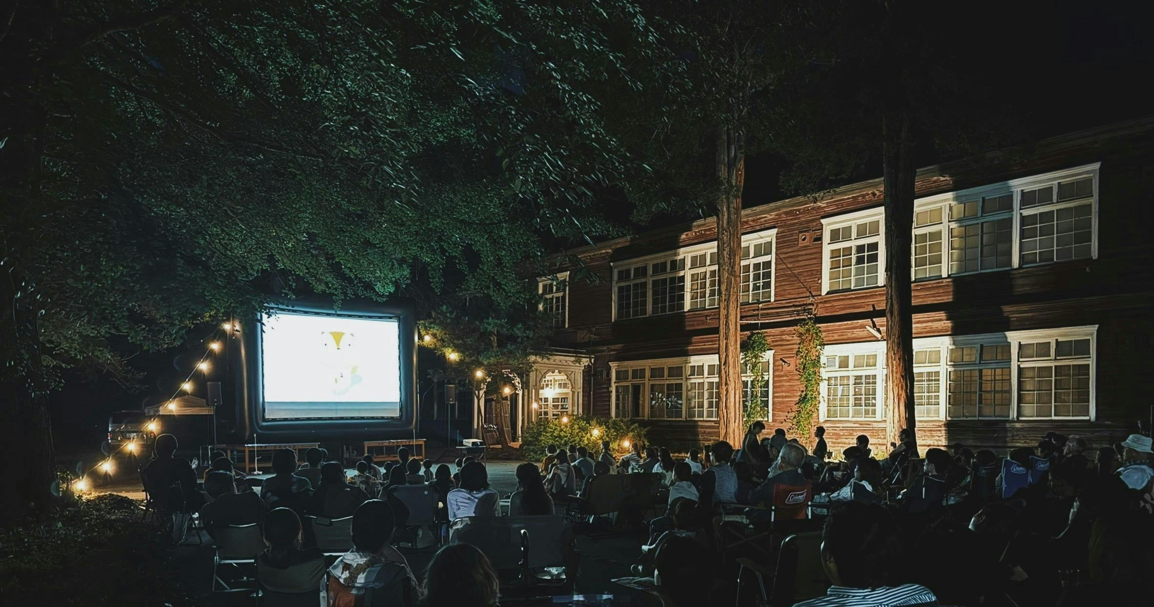 古い学び舎の佇む群青の森の広場に、映画の光を映して燦めくたくさんの瞳。