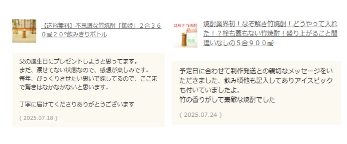 竹の性質上時々、配送中に割れてしまうことがございます。その際はすぐにお知らせください。変わりの焼酎をすぐに手配致します。