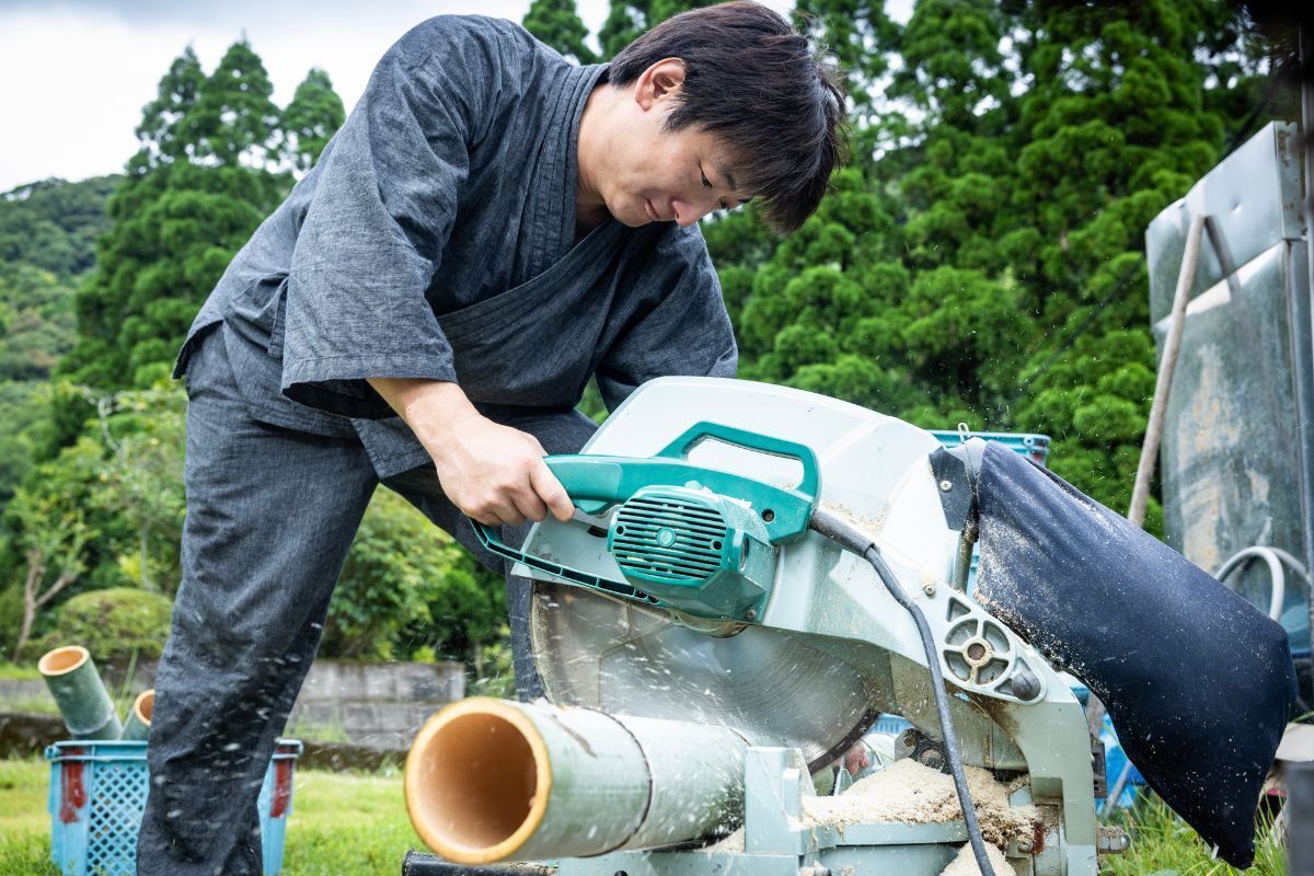 お試しサイズの”篤姫”、少し大きめの"薩摩翁"のサイズに合わせて竹筒をカットしていきます