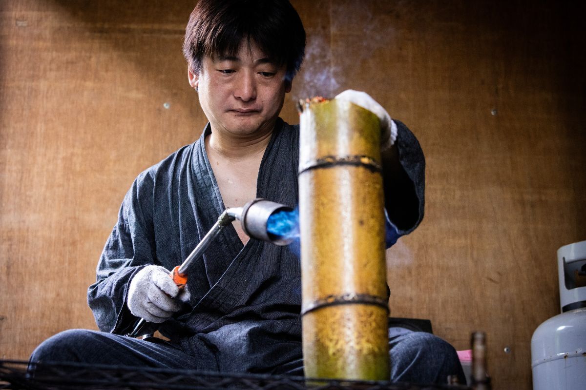 生竹の状態では水分が多すぎるのと油分が焼酎封入には適していないため、バーナーで油抜き、20~30分の水抜きを行います