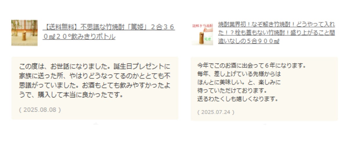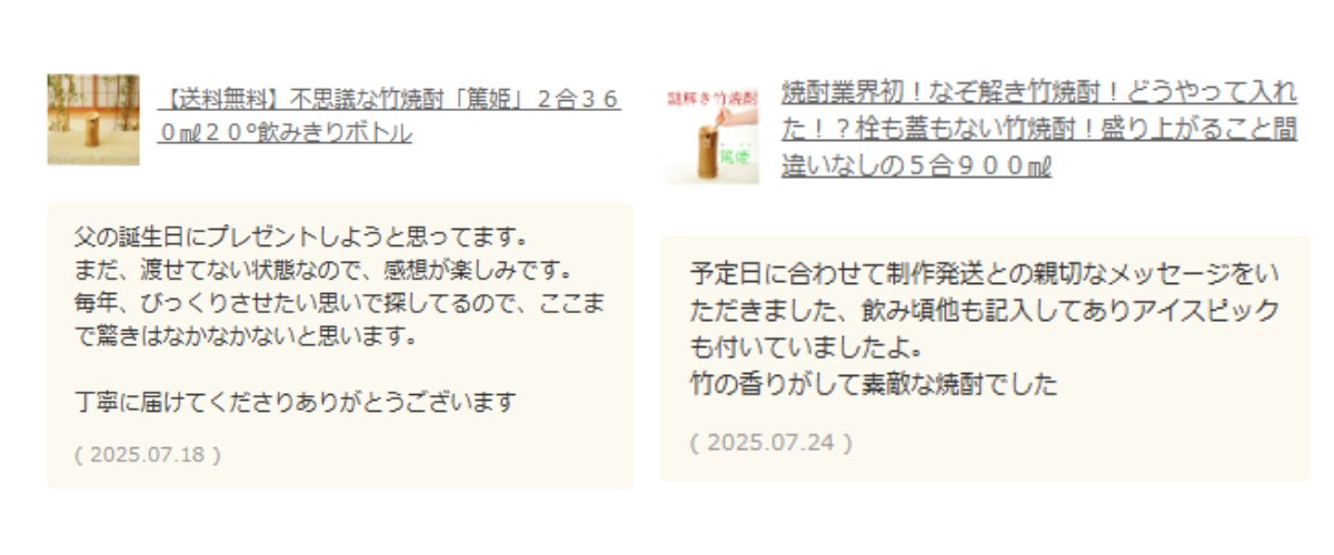竹の性質上時々、配送中に割れてしまうことがございます。その際はすぐにお知らせください。変わりの焼酎をすぐに手配致します。