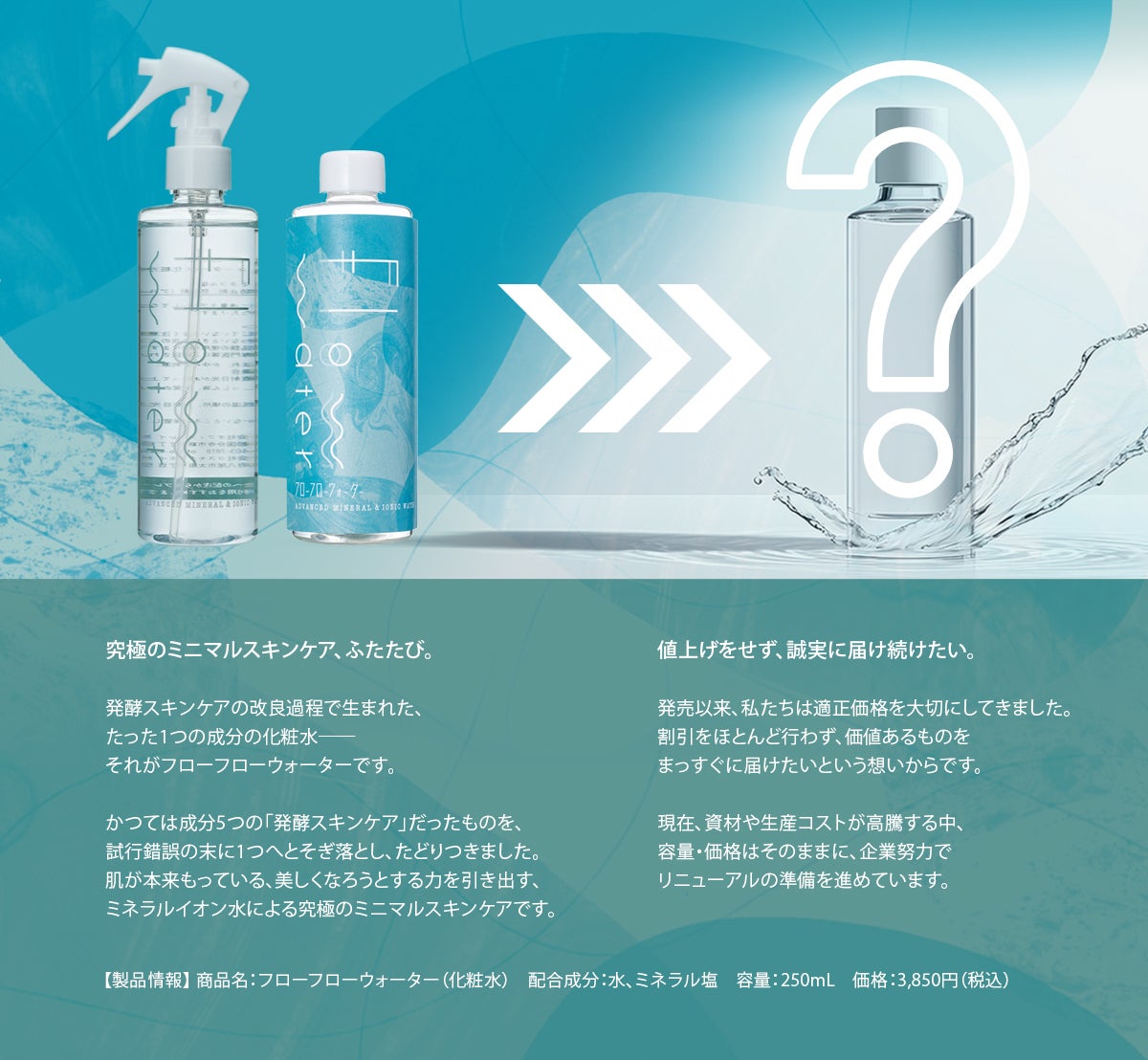 フローフローウォーターの成分は1つ。肌が本来持っている、自ら美しくなろうとする力を「引き出す」ために至った究極のミニマルスキンケアです。>> flowflow.jp/water