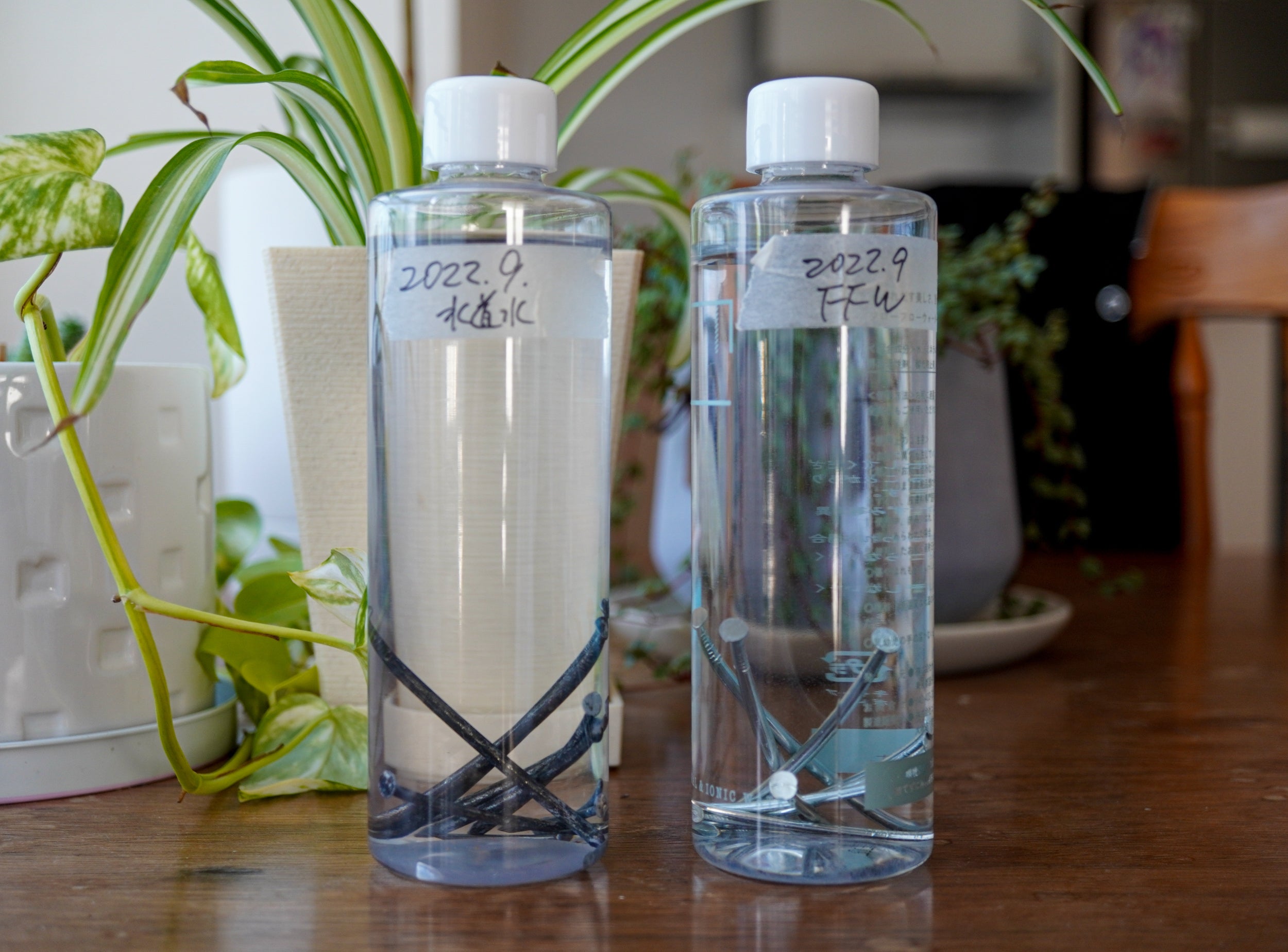 2022年9月、2本のボトルに釘(大中小、同じ本数)を入れ、それぞれに「水道水」と「フローフローウォーター」を注ぎました。写真は今、現在の状態です。