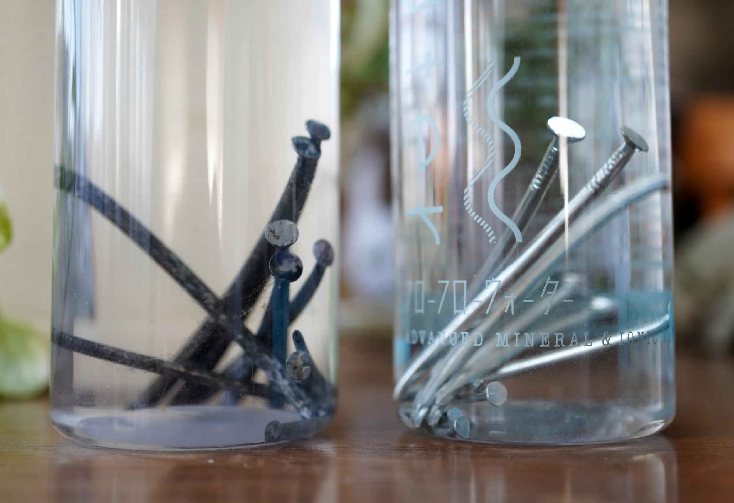 水道水の中の釘は黒く変色し、フローフローウォーターの中の釘は、今もほとんどそのままの輝きを保っています。