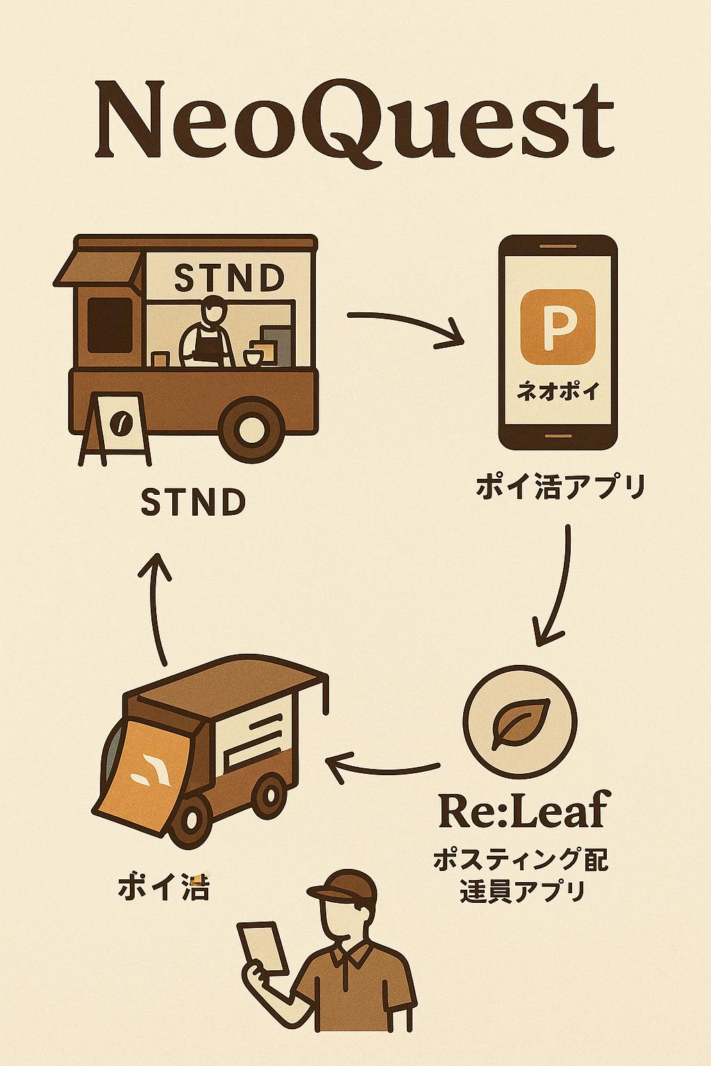 そこで、STNDと連動する「ポイ活アプリ」と、配布側の行動や反響が可視化できる「Re:Leaf(ポスティングアプリ)」を次なるステップで構想中です。