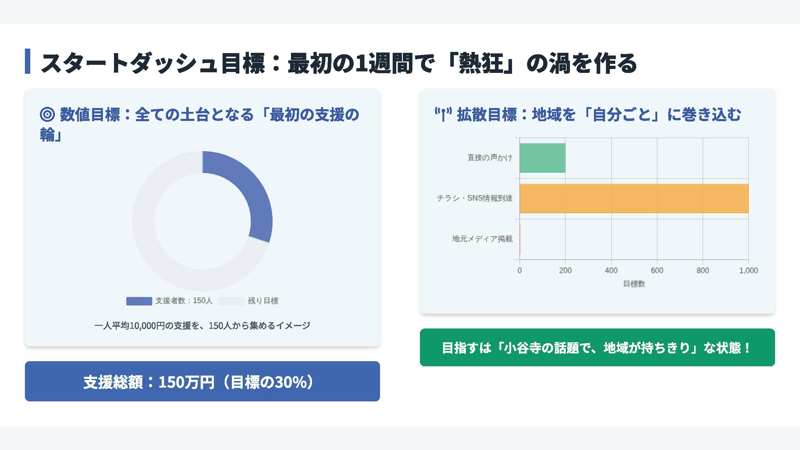 クラウドファンディングには「開始から最初の1週間で、第一目標額の30%を達成できると、最終的な成功率が飛躍的に高まる」というセオリーがあります。