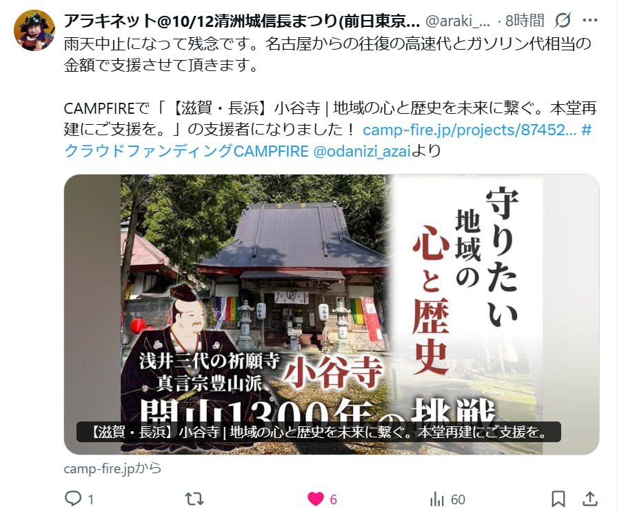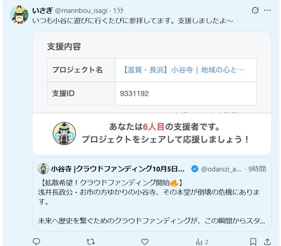 「いつも小谷に遊びに行くたびに参拝してます。支援しましたよ~」
