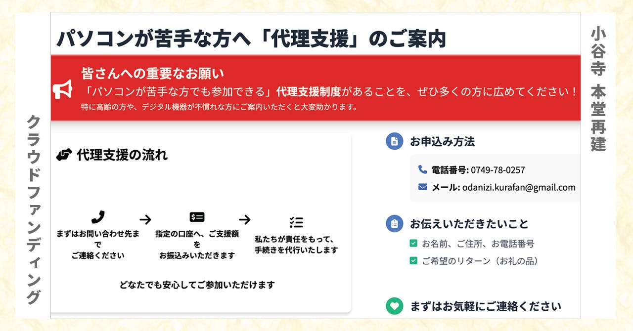 この小谷寺を、地域の宝として長年見守り続けてくださった方々のその温かいお気持ちを、デジタルの壁というだけで諦めてほしくない。その一心で、私たちは「代理支援」という方法をご用意いたしました。