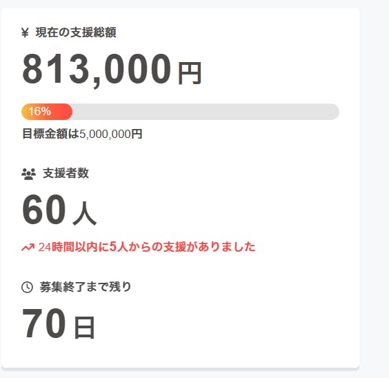 皆様のおかげで、本日までに 60名 の方々から 800,000円 という、本当に、本当に温かいご支援をいただくことができました。目標達成率にして16%、最高のスタートダッシュを切ることができました!