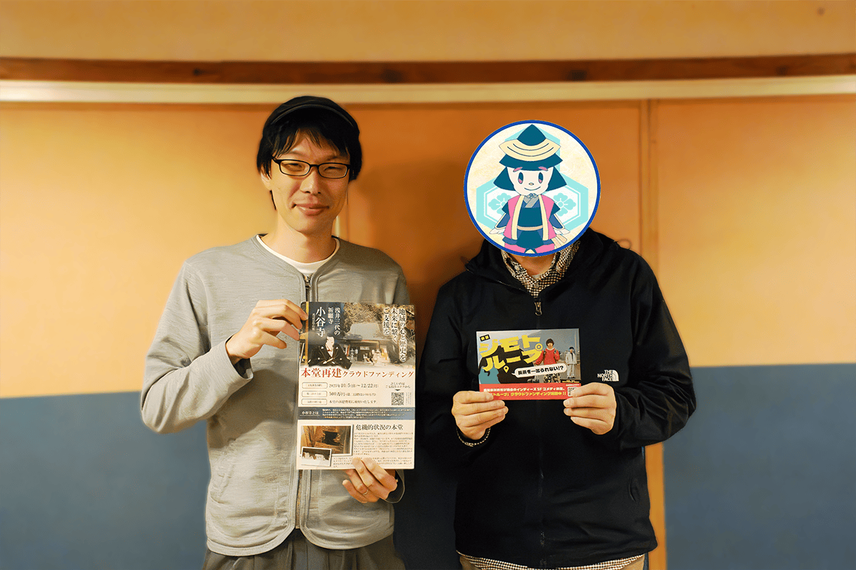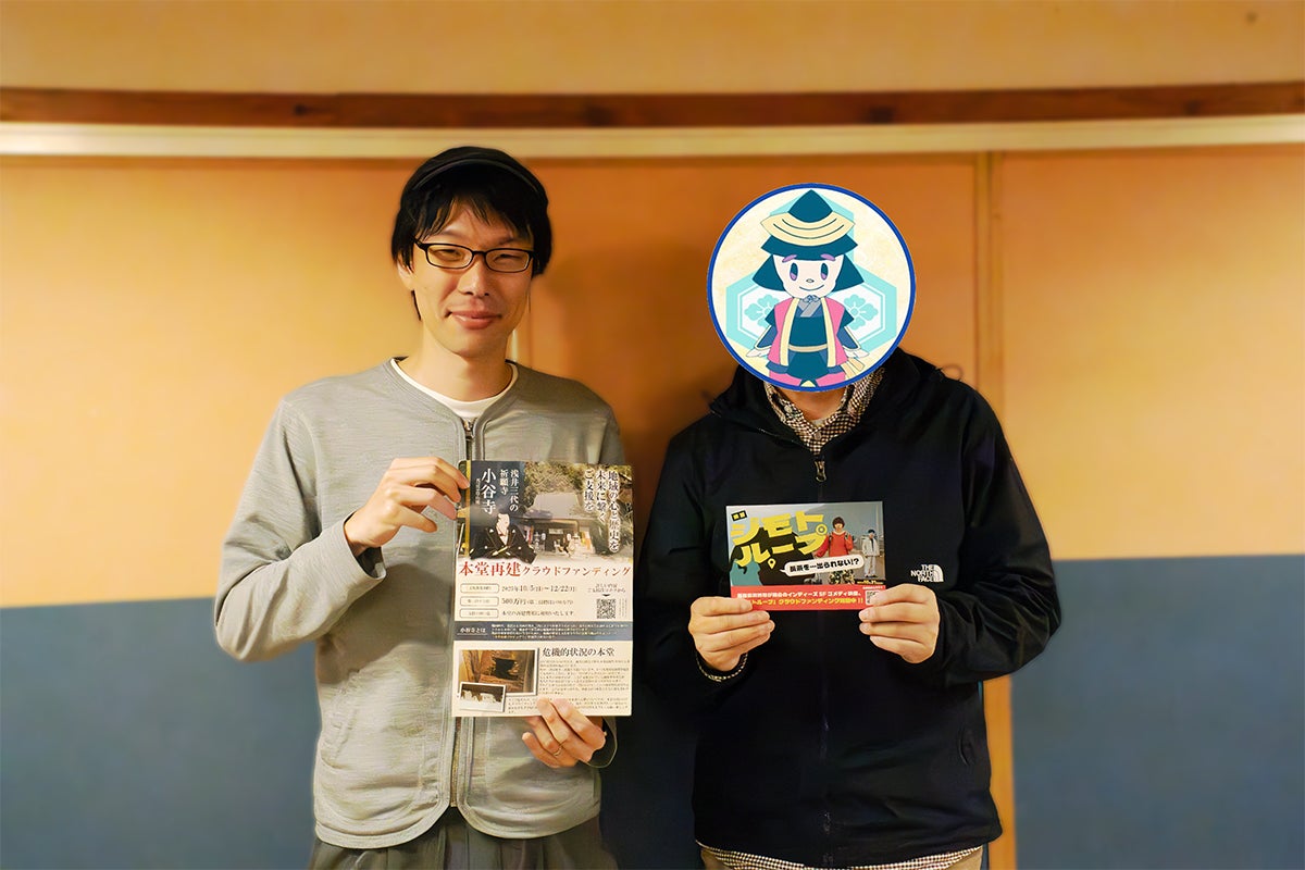 対談では、お互いの出身校(虎姫高校)の話などで大いに盛り上がりつつ、私たち小谷寺の本堂再建クラウドファンディングと、映画『ジモトループ』をより良いものにするためのクラウドファンディング、「同じ長浜で、歴史や文化を未来に繋げようと頑張る“仲間”」として、ドンドン協力して盛り上げていこう!という熱いお話をさせていただきました。