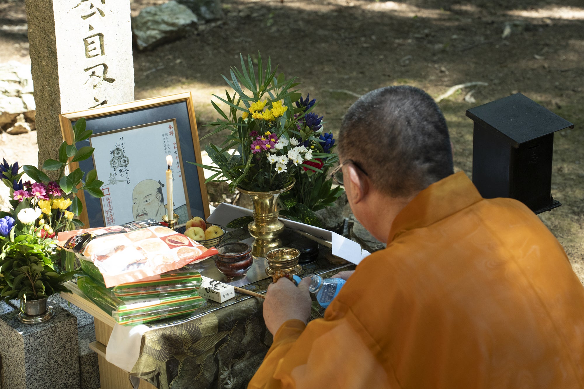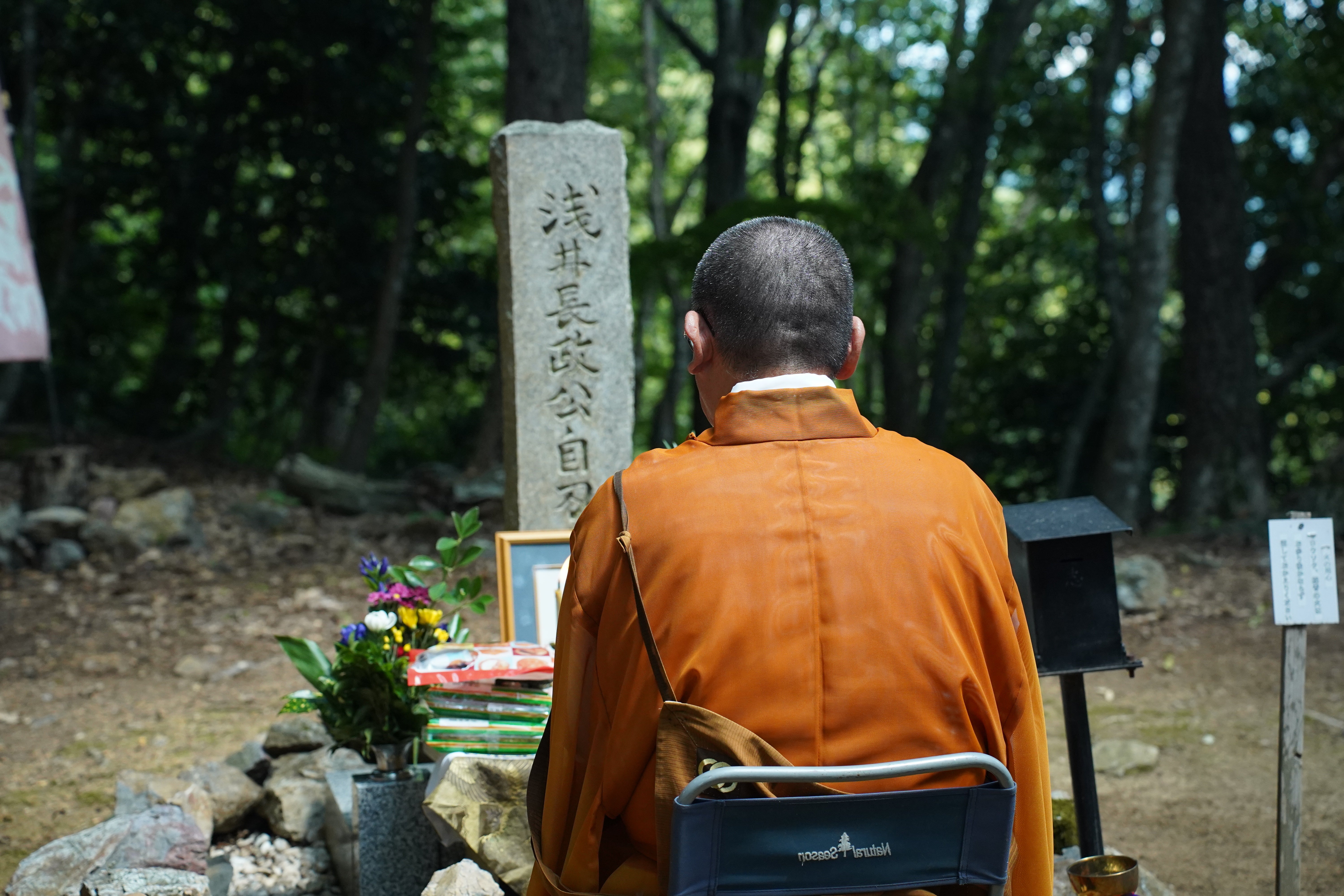 草木が生い茂る静寂な山中、かつて彼が最期の時を過ごしたその場所で、安田住職が読経を行います。 お経の声が山に響くとき、私たちはいつも胸が締め付けられるような思いになります。「長政公は最期に何を願い、誰を想ったのだろうか」と。その魂に寄り添い続けることこそが、小谷寺の最も大切な務めだと信じています。