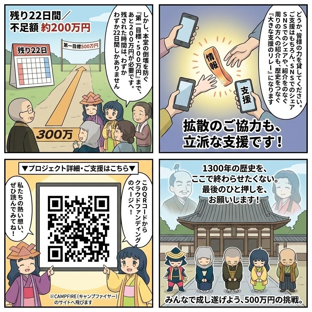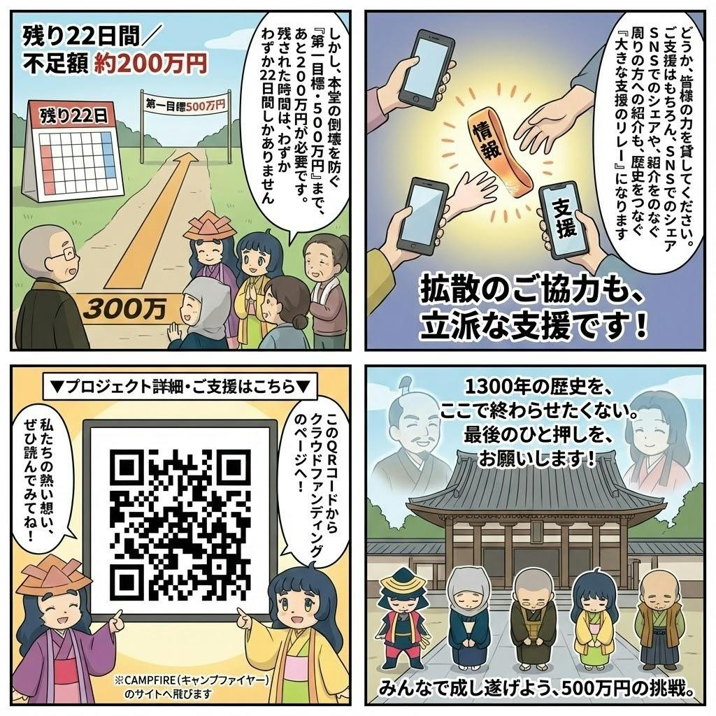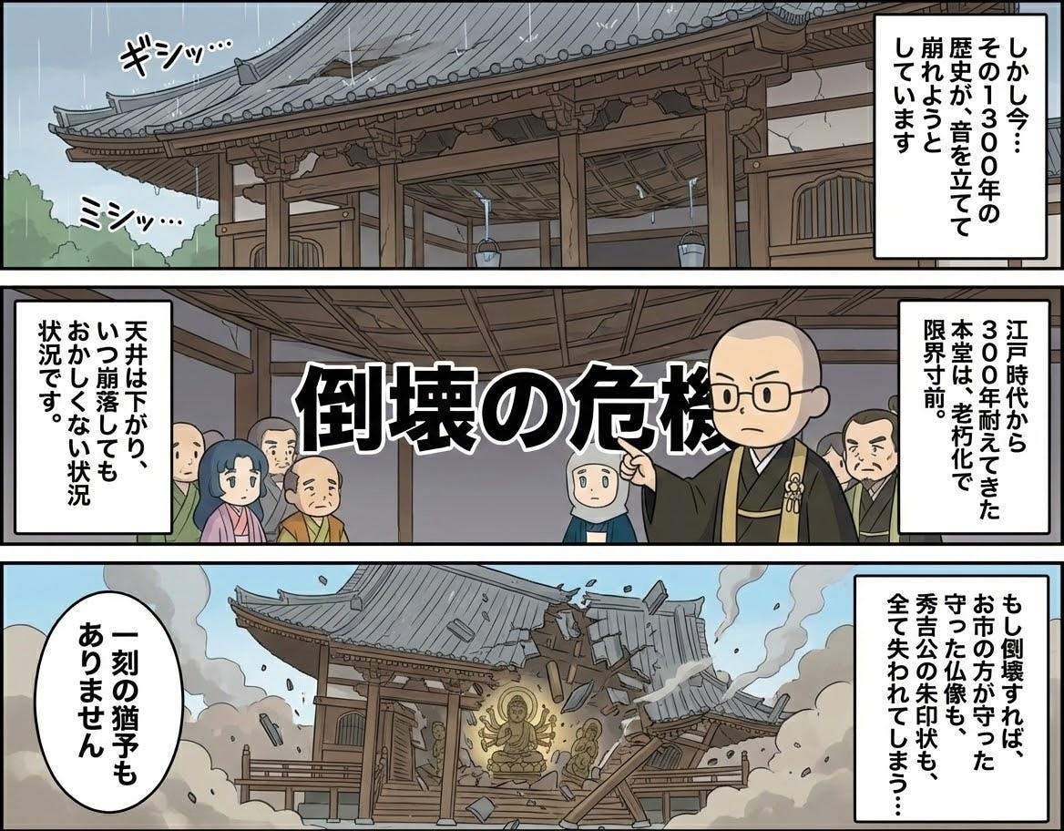 ここからが、正念場です。 目標金額達成に向けて、まだ道半ば。しかし、この歴史ある本堂を倒壊の危機から救うためには、ここで足を止めるわけにはいきません。
