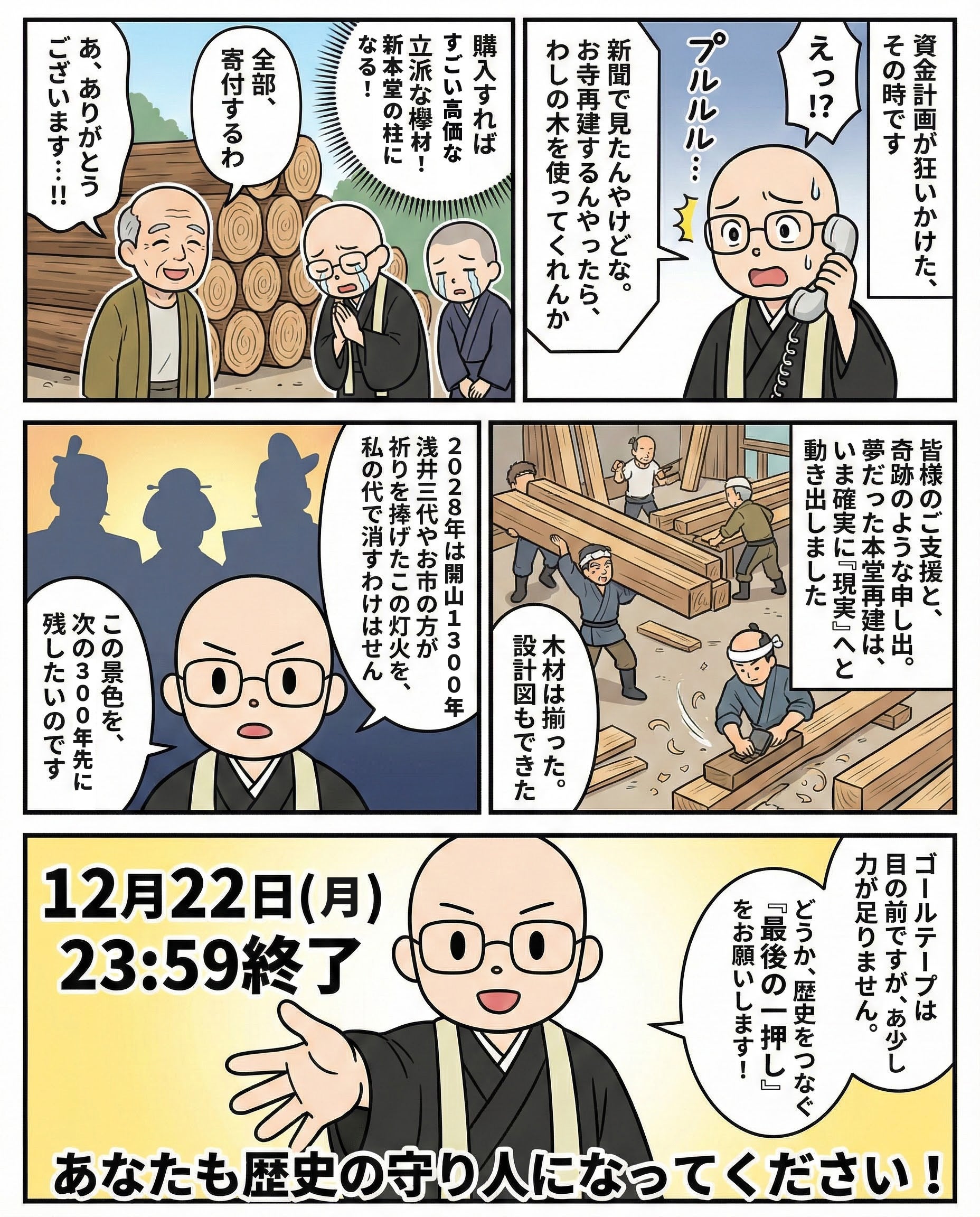 文章だけでは伝えきれなかった「本堂再建の具体的な計画(図面)」と、私たちが直面した絶望を救った想定外の奇跡」、そして「1300年の節目を迎える覚悟について包み隠さずお話ししています。