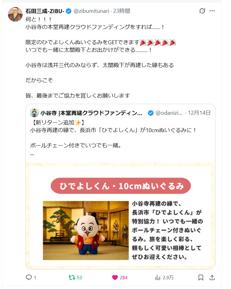 かつて寺を救った天下人が、時を超えて、令和の今またキャラクターという姿で「小谷寺を救おう」と立ち上がってくれた……。