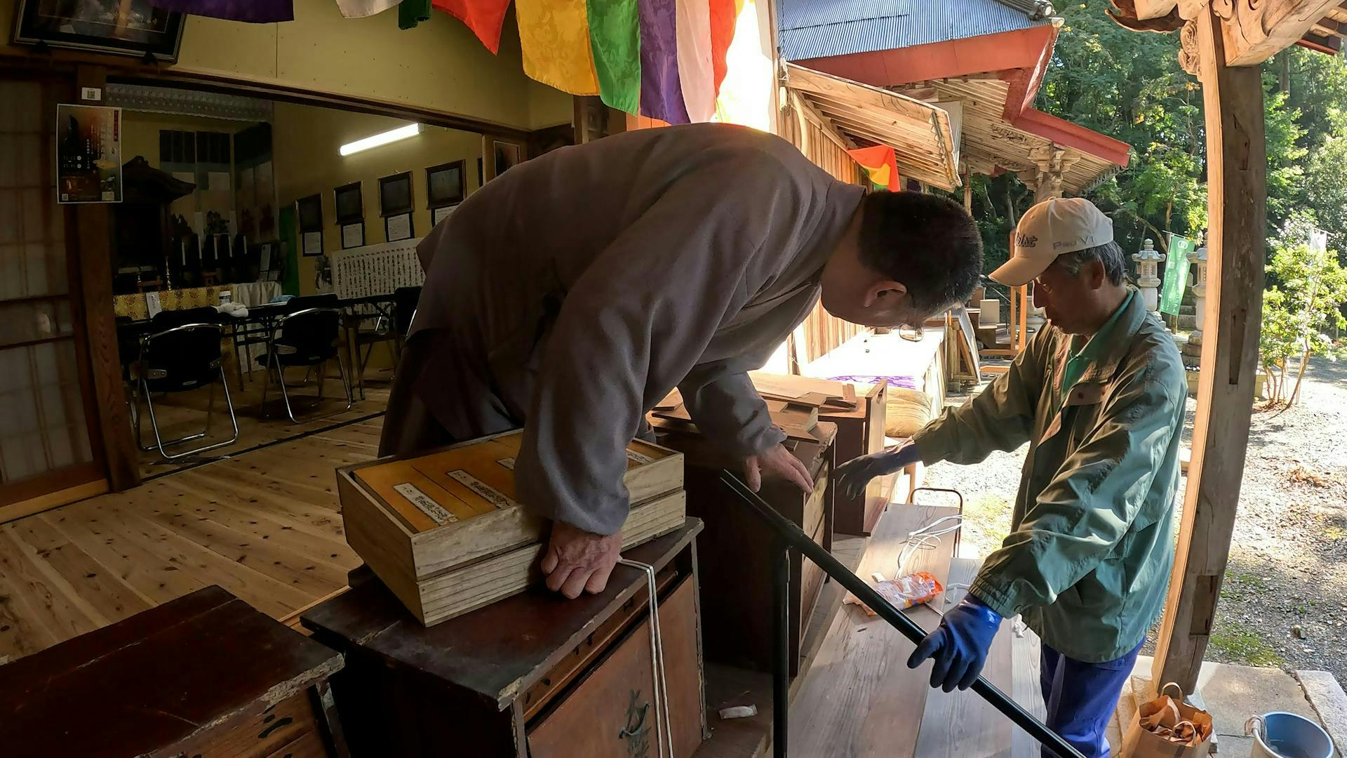 古い木箱に入った経典は非常にデリケートです。蔵の中では滑車を使って慎重に上へと運び、虫害を防ぐための防虫剤とシートで厳重に保護しました。
