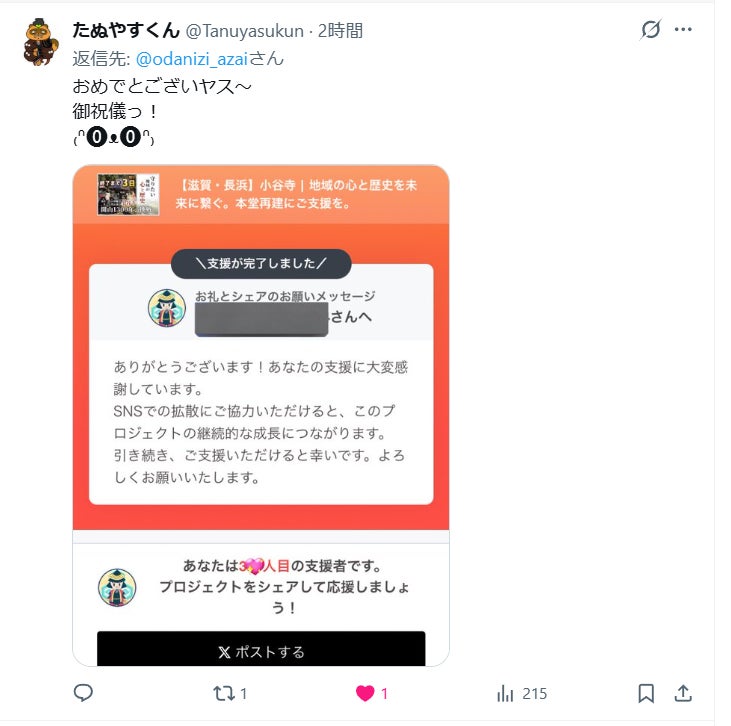 皆様のSNSでのシェアや、ご友人への「浅井長政公やお市の方様ゆかりのお寺が、今頑張っているよ」というひとことが、ラストスパートの爆発的な力になります。