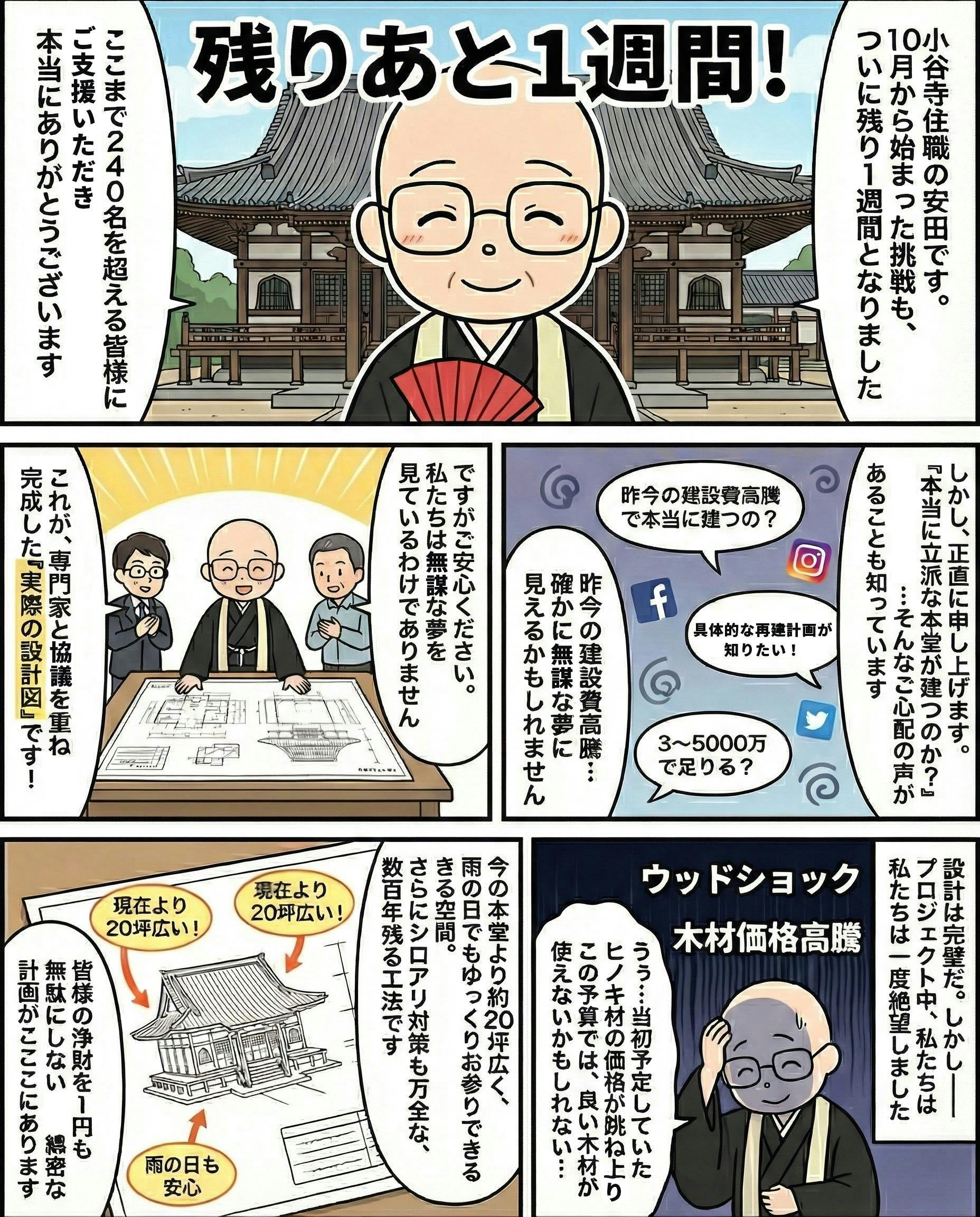 プロジェクトが進むにつれ、多くのご支援をいただく一方で、現実的なご質問もいただくようになりました。 「昨今の建設費高騰の中で、本当に立派な本堂が建つのか?」 「具体的な再建計画はどうなっているのか?」