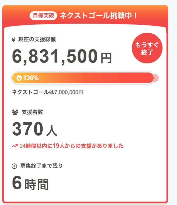 クラウドファンディング終了まで、【残りわずか「6時間」】となりました。