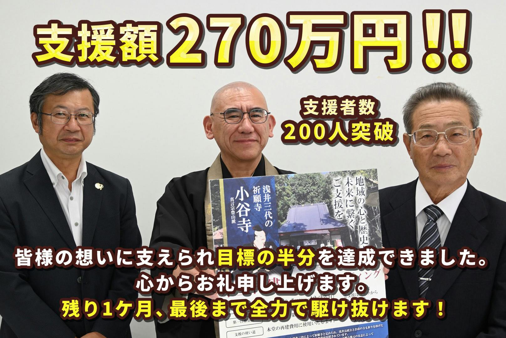 2025/11/30 21:40プロジェクト開始から約2ヶ月。現在の支援総額が300万円を超え、支援者数が200名という、大きな節目を突破いたしました!檀家ゼロの挑戦、正直不安でいっぱいでした。しかし今、200名もの仲間が支えてくれています。共に歩んでくださる皆様に、心より感謝申し上げます!そして、明日からはいよいよ12月。このプロジェクトも、残り22日となります。ここからが、正念場です。 目標金額達成に向けて、まだ道半ば。しかし、この歴史ある本堂を倒壊の危機から救うためには、ここで足を止めるわけにはいきません。そこで、すでに「仲間」となってくださった皆様に、一つお願いがございます。このプロジェクトを、皆様の周りの方へ「拡散」していただけないでしょうか。皆様が少しでも伝えやすくなるよう、「小谷寺プロジェクト解説マンガ」を作成いたしました! 漫画を通じて、歴史の難しい話もすぐイメージしやすくしました!「なぜ今、修復が必要なのか?」 「小谷寺ってどんな歴史があるの?」これらを、分かりやすく、親しみやすくまとめました。友達や周りの方に 「このマンガ、ちょっと読んでみて!」という軽い一言と共に、SNSやLINEでシェアしていただけると、私たちにとってこれ以上ない力になります!!▼以下のクラウドファンディングリンクと一緒ご共有くださいhttps://camp-fire.jp/projects/874521/view浅井長政公やお市の方が祈りを捧げたこの場所を、次の1300年へ繋ぐために。 最後の22日間、私たちと一緒に走り抜けていただけないでしょうか。皆様の力を、どうかお貸しください。 よろしくお願いいたします。 もっと見る